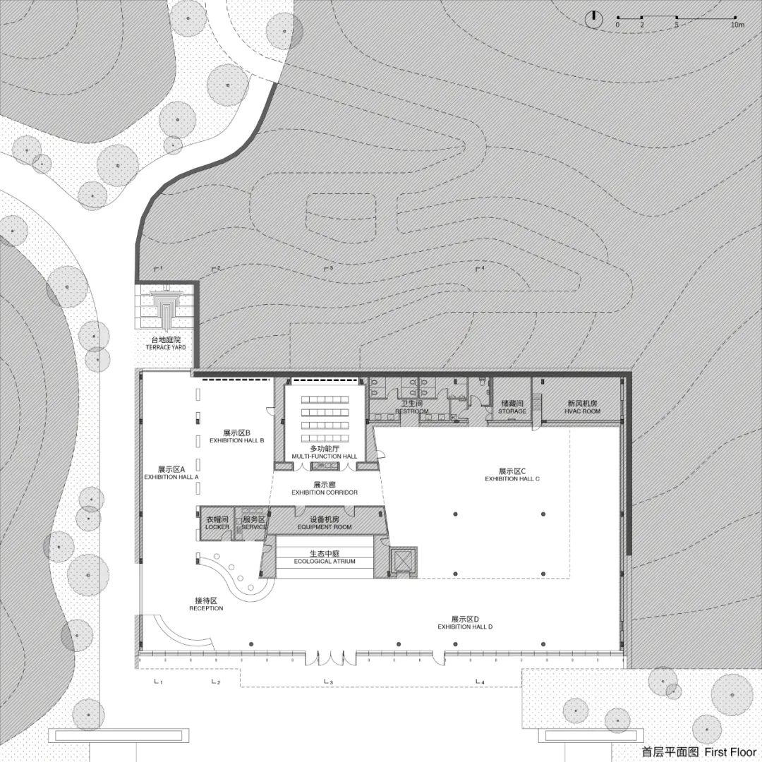设计之初,为有更灵活的布展自由度,故将展陈空间集中设置,建筑的整体的功能空间按照入口接待区,中庭区,集中展陈区,自西向东一字排开。