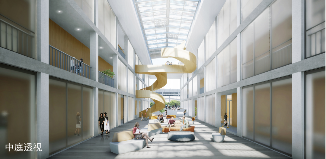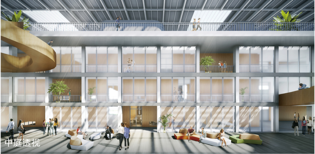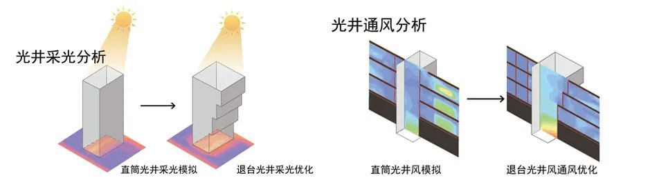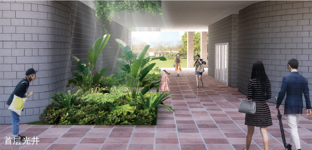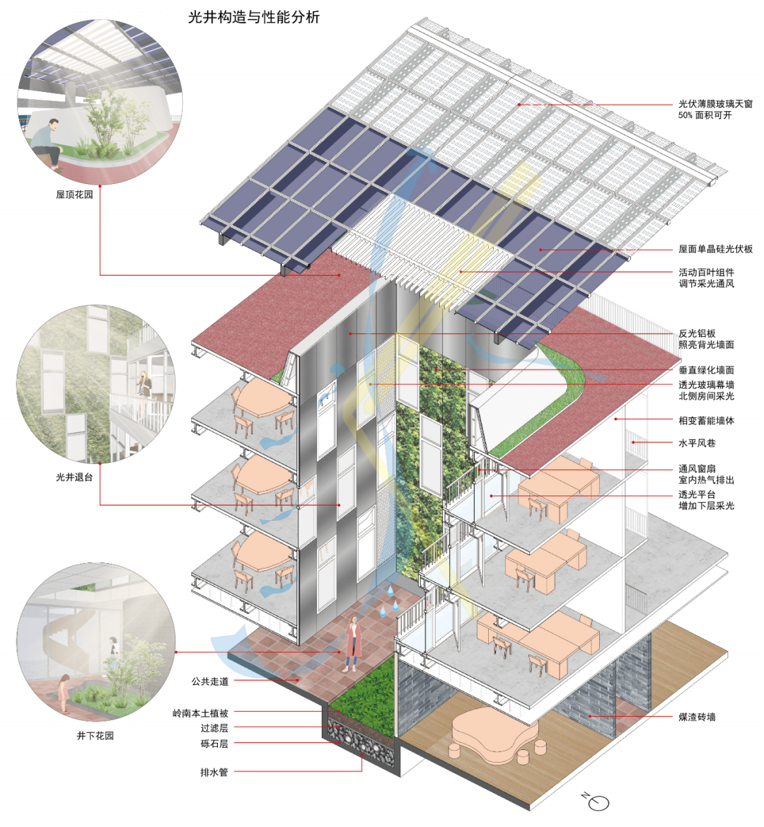 汲取岭南传统竹筒屋设计智慧,引入竖向“光井”与水平“风 巷”,回应办公空间的光、热、风物理环境痛点。设置竖向“光井”解决主体办公空间南北进深过大而到导致采光痛点,为室内带来充足日光。光井还兼顾通风组织、雨水收集、蓄能调温、景观引入、视线沟通等综合功能,成为整合统筹光、热、风等因子的“能 量之井”。