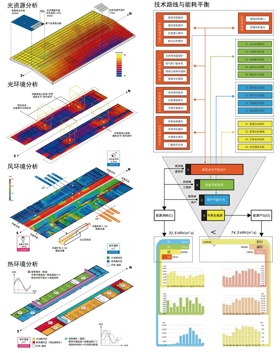 立足我国“双碳目标”与“城市更新”两大可持续发展战略,本项目选取广州市广纸片区滨水煤仓工业遗产开展可持续更新改造,意图打造适应岭南地区气候的主动式办公建筑实验与示范平台,实现“工业遗产—创意办公”功能融合,“岭南气候—主动建筑”适宜整合,以及“旧能源—新能源”更新迭代。经设计测算,本项目综合电耗水平为32.5kwh/(m2·a),仅为我国近零 能耗建筑标准的40%,发电量可达74.3kwh/(m2·a),实现运行阶段零能耗,助力全生命周期碳中和目标。