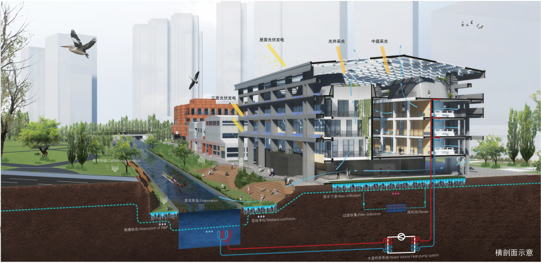 由工业煤仓转变为充分利用清洁与可再生能源的新型办公建筑,是对双碳目标与能源转型的有力回应。建筑屋立面采用光伏一体化设计,提供可覆盖建筑运行能耗的清洁能源。利用滨水优势,借助水源热泵系统降低暖通电耗。