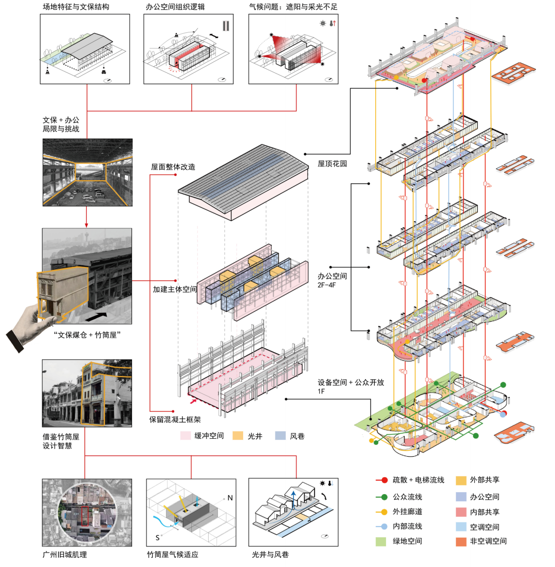 煤仓空间的办公化需求衍生出一系列性能痛点,提出“工业厂房+竹筒屋”的概念,广州传统竹筒屋利用冷巷与天井等方式适应岭南湿热气候,其解决路径恰好与方案需求不谋而和,因而两者跨时空、跨尺度与功能相互融合。