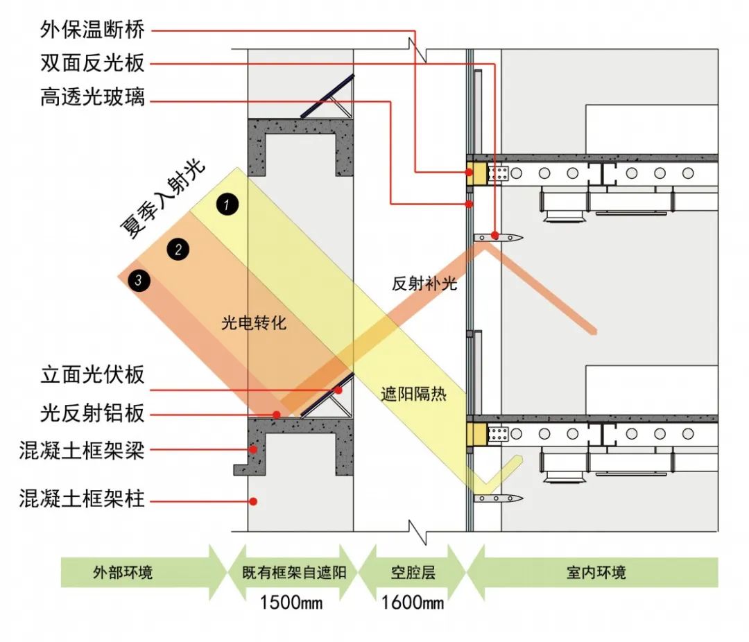 项目强调基于建筑本体设计的主动节能表现,营造连续包裹核心办公空间的“气候缓冲层”,由架空设备底层、空中花园与东西侧混凝土框架构成,可最大限度隔绝不利太阳辐射、湿分与热气影响,显著降低建筑本体节能负担, 也可满足遗存构件的文保需求。