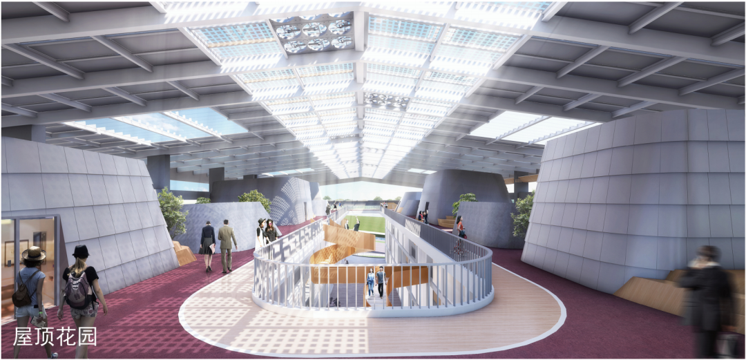屋顶花园朝向室外开放,由若干锥型体块组合而成,呼应延续煤仓场所记忆。屋面结构一体化整合光伏发电、遮阳、通 风、采光等多元功能,为屋顶花园乃至下方空间提供气候屏障。屋顶花园设有环形跑步道与休闲漫步道,结合健身房、书吧等 功能,营造活力共享的休憩交流空间。