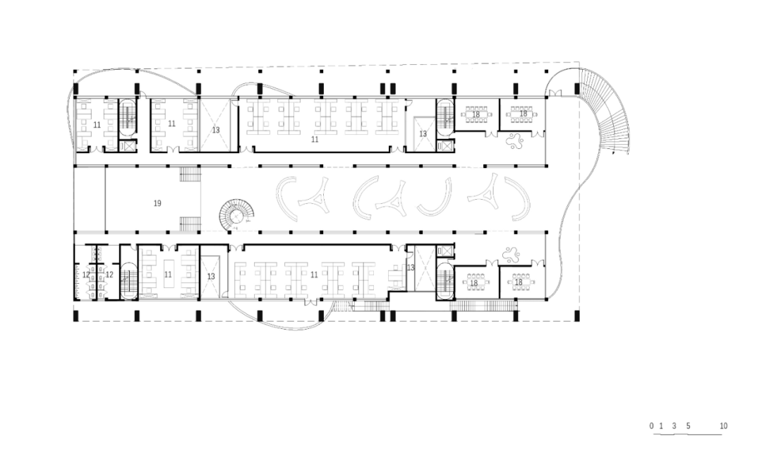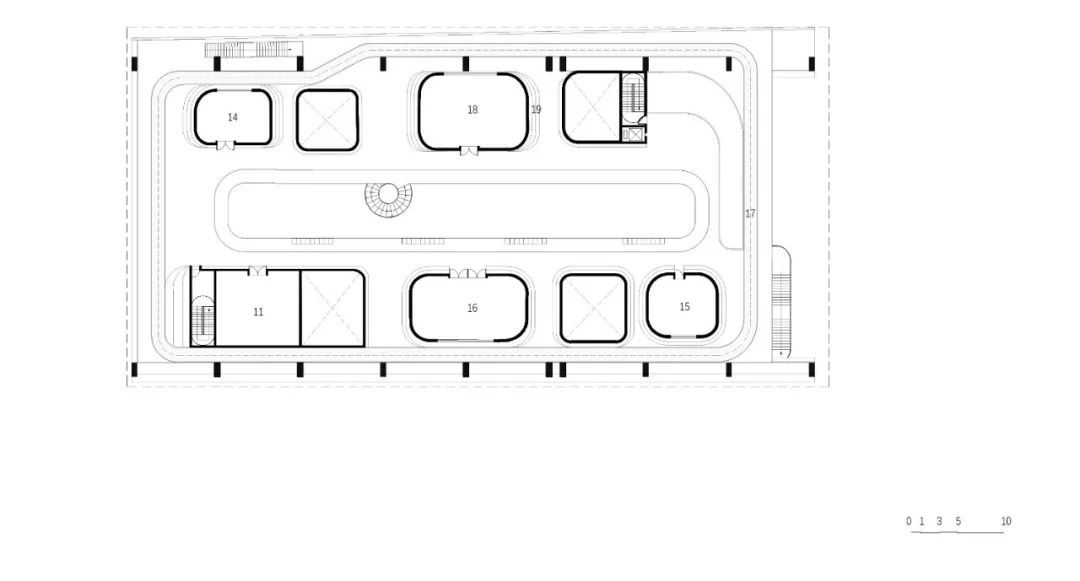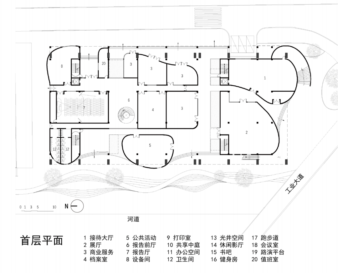 建筑首层包含接待展示、设备辅助与公共活动三大功能空间,采用曲形墙面设计,沟通引导场地东西侧的人流、视线与通风,连接园区与滨水岸堤,为公众提供共同服务与活动空间,让建筑轻盈介入场地,降低对周边环境的干扰。首层曲形墙采用煤渣再生砖砌筑,降低材料蕴能且避免主体受潮风险。
