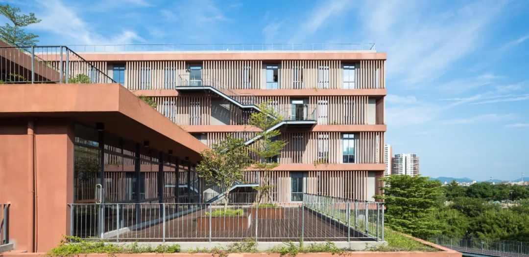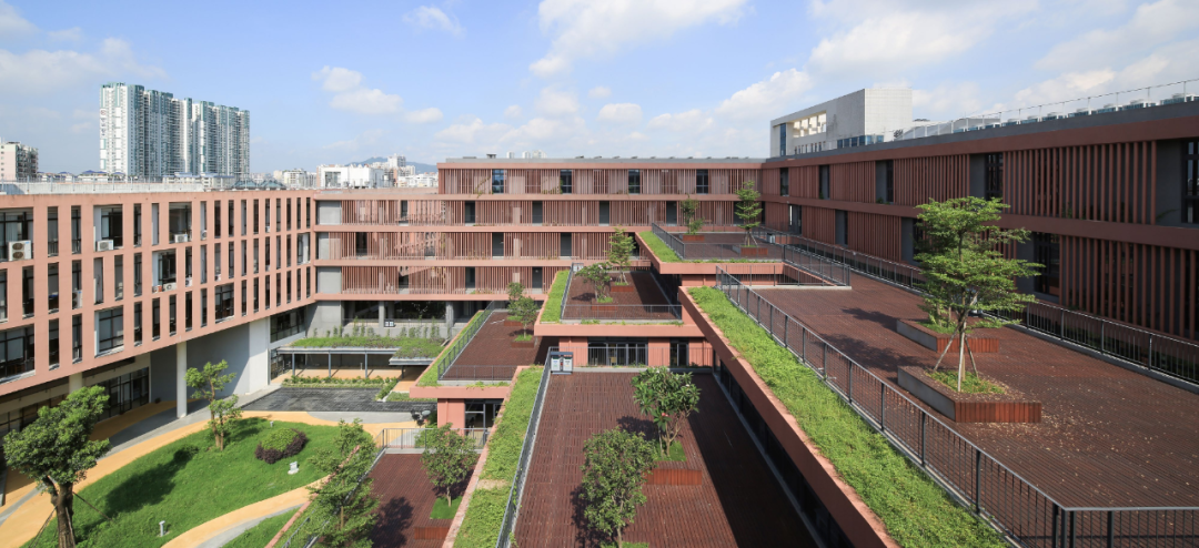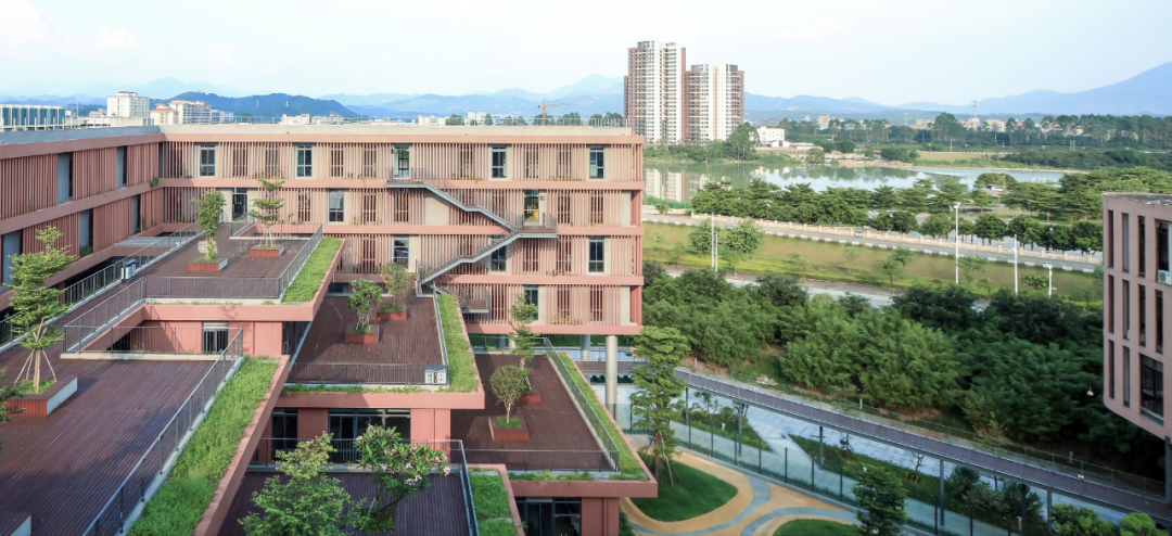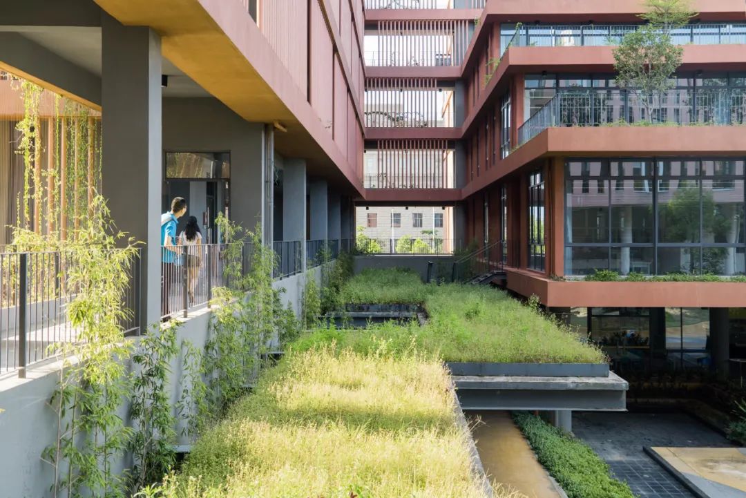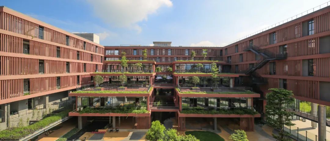 通过 U 型的平面布局,与一期图书馆形成围合式庭院,同时建筑立面沿河岸展开,最大化利用河岸景观。在庭院一侧采用层层退台的立体园林绿化。建筑布局引入骑楼、天井、风巷、中庭等岭南建筑常用的建筑方式。