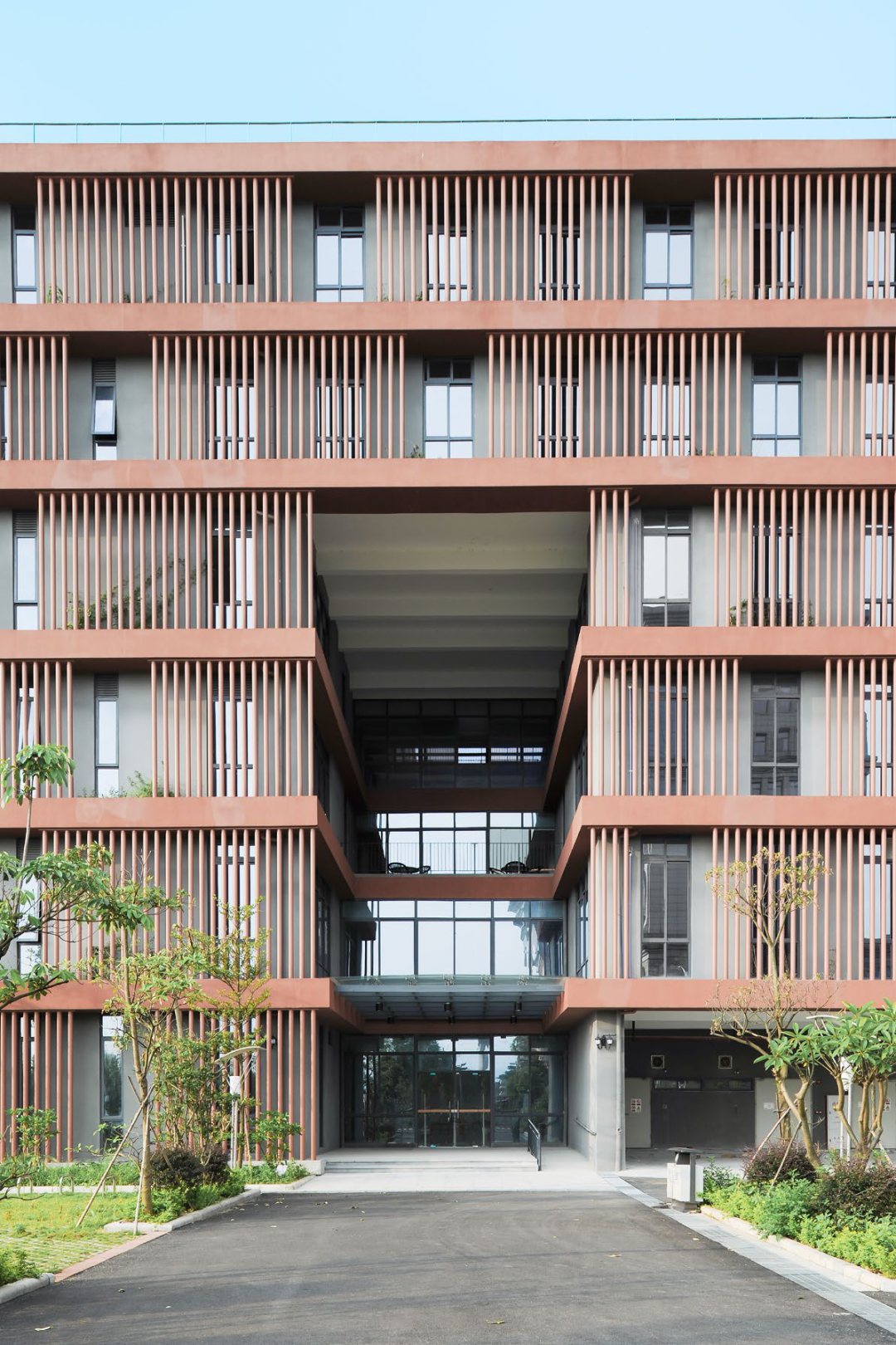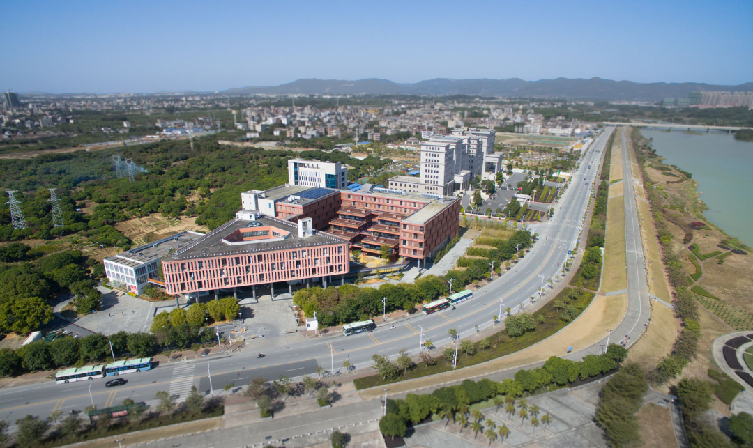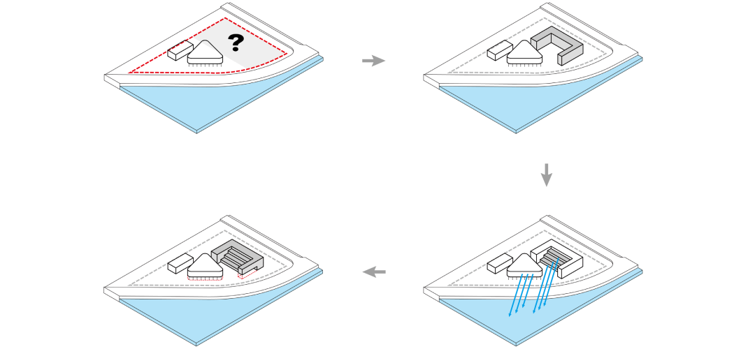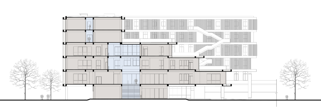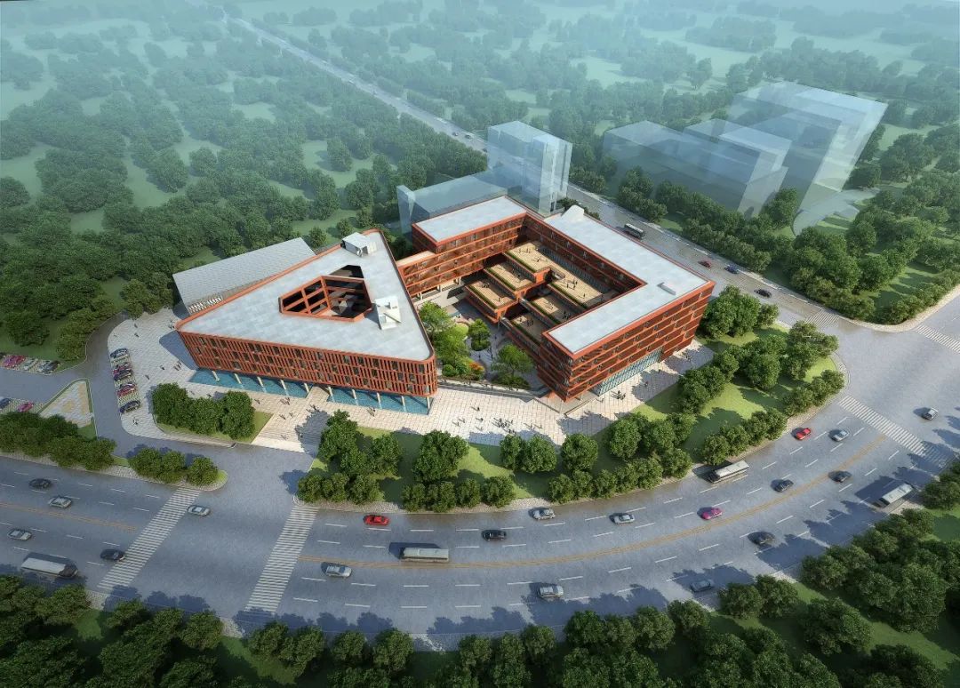 通过 U 型的平面布局,与一期图书馆形成围合式庭院,同时建筑立面沿河岸展开,最大化利用河岸景观。在庭院一侧采用层层退台的立体园林绿化。建筑布局引入骑楼、天井、风巷、中庭等岭南建筑常用的建筑方式。