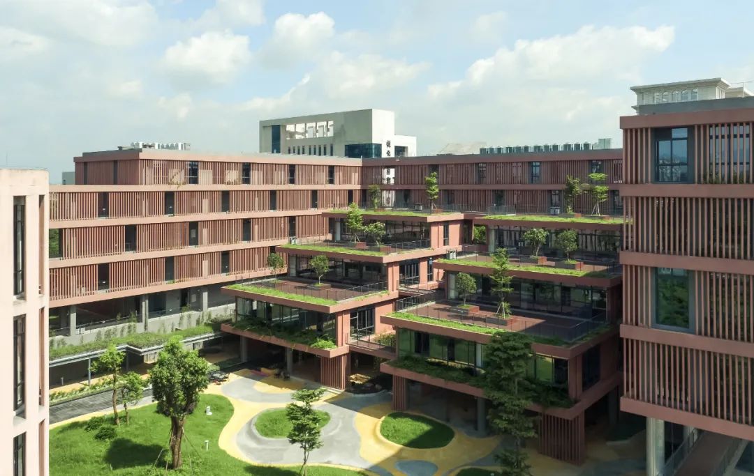 二期面向主庭院的首层同样采用局部架空的形式,并设休闲咖啡座,为青少年及家长营造安全舒适的活动环境。二期在3~5 层通过退台形成空中花园露台,既减少了建筑对首层的压迫感,又与地面的中央庭院彼此呼应,形成竖向上连贯的立体景观系统,一直向流溪河延伸。