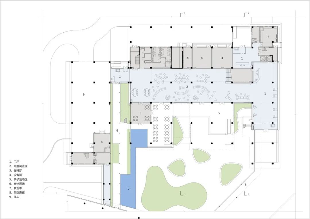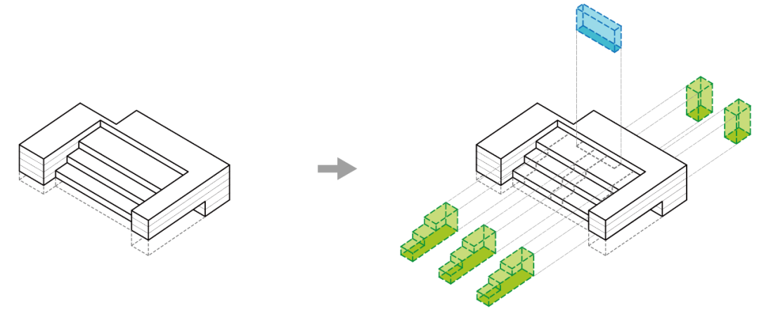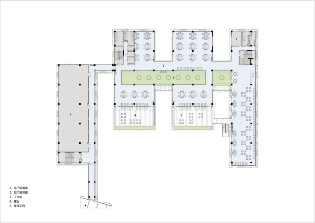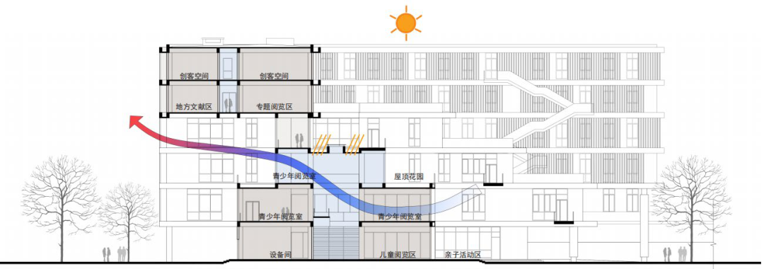 庭院系统——建筑布局围绕大大小小的庭院展开,庭院不仅位于首层,还向上延伸至其他楼层,彼此连通形成立体的庭院系统,为读者提供多样化的阅读休憩空间,同时改善建筑热环境,提升空间舒适度。
