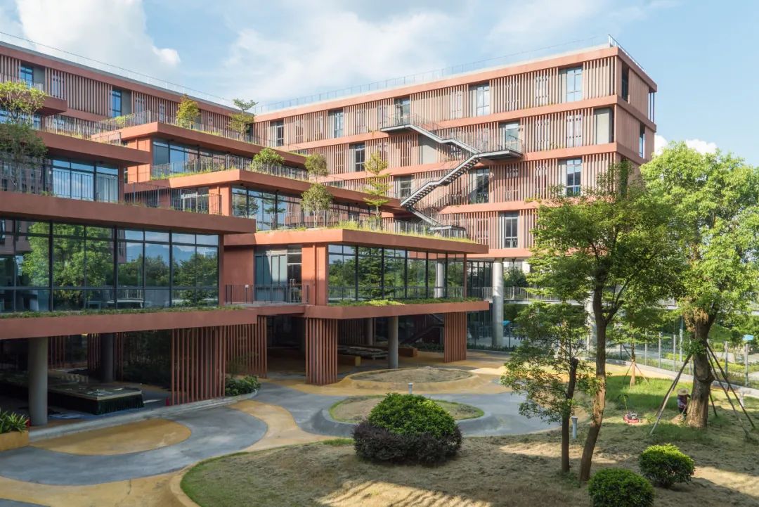 合理采用屋顶绿化方式,绿化物种选择适宜当地气候和土壤条件的乡土植物,且采用包含乔、灌木的复层绿化。室外绿化选用了樟树、红继木、美丽异木棉、花叶良姜、鸭脚木、银叶金合欢、鸡蛋花、银边兰、花叶女贞、彩虹朱蕉、散尾葵、台湾草等绿化。