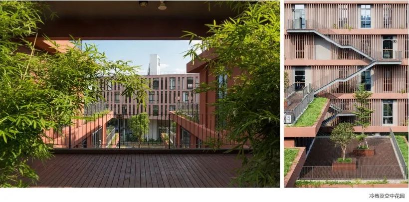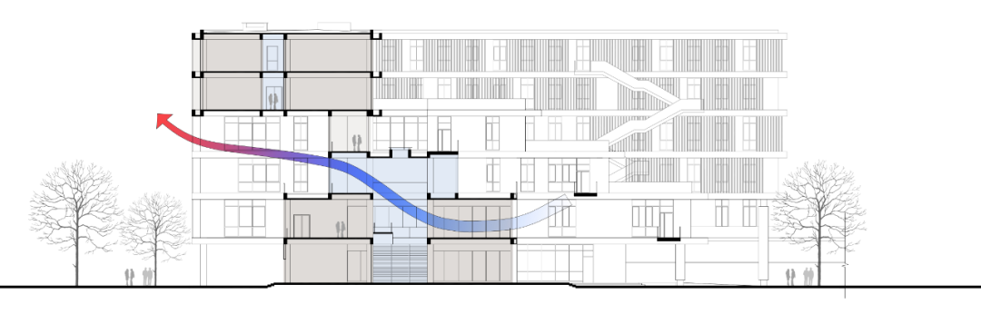 针对二期建筑采用的大进深布局,特意设计了三条南北向贯通的“冷巷”空间,有效解决了大进深空间带来的通风采光问题。在气候适宜的交换季,只要打开走廊两侧面对冷巷的窗户,就能形成南北向的穿堂风道,带动室内的空气流动。