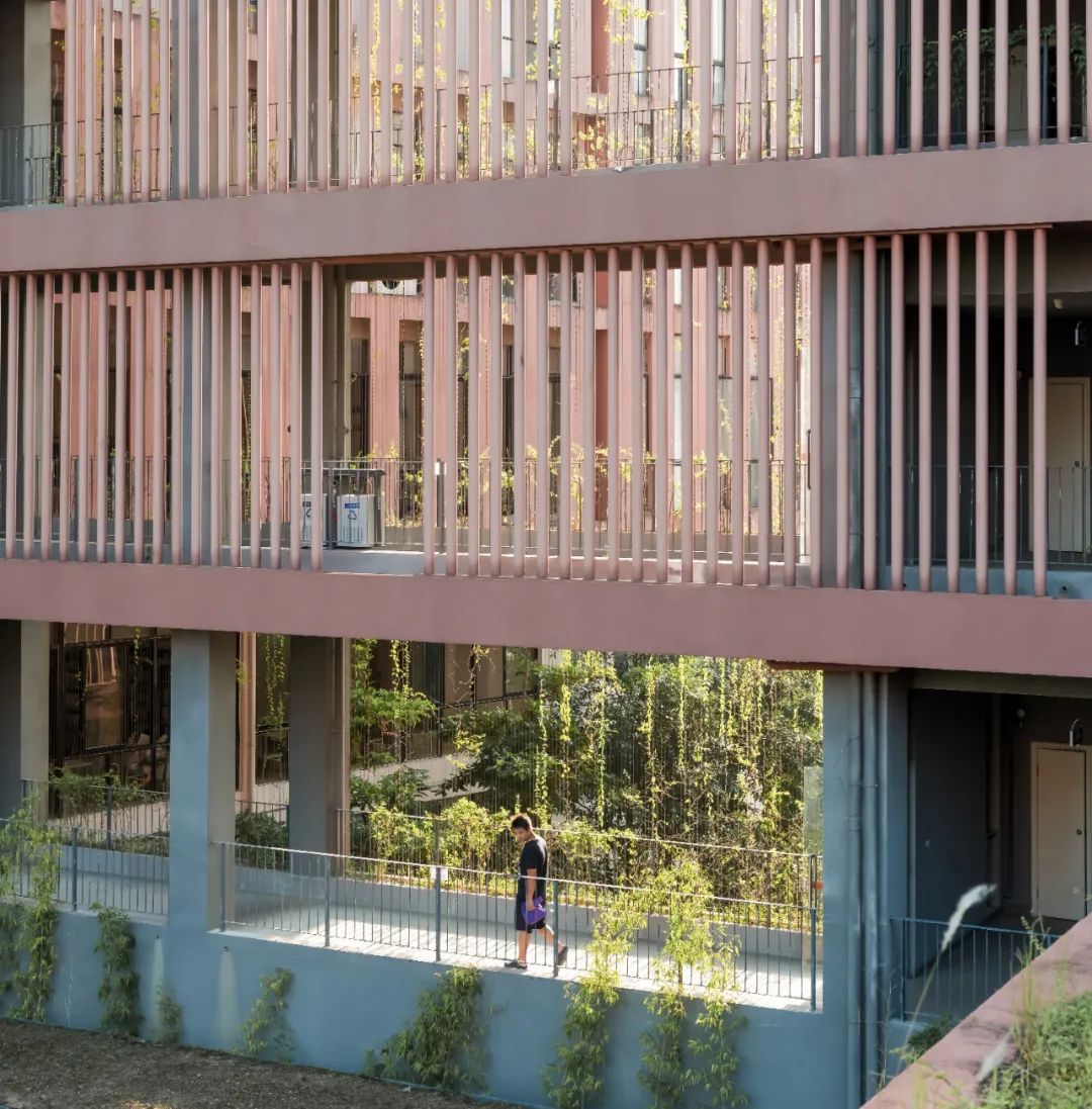 密排的圆形管材与太阳光稍有角度便能达到同样致密的遮阳效果,同时使视线能够穿越,并有效漫射光线。圆管遮阳单元下部还设置种植槽,藤蔓植物可沿圆管攀爬而上,增强遮阳效果的同时为图书馆的立面增加了绿色意趣。