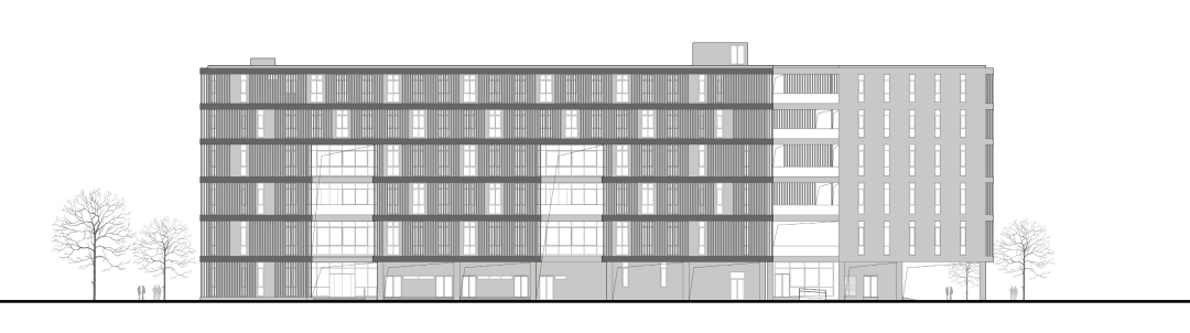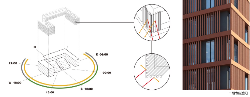 建筑外窗可开启面积不小于外窗总面积的 30%,双层复合立面在窗外楼层部位挑出70厘米形成水平遮阳板,结合垂直遮阳板,共同构成复合型双层表皮,并在不同朝向采用不同的立面布置方式。