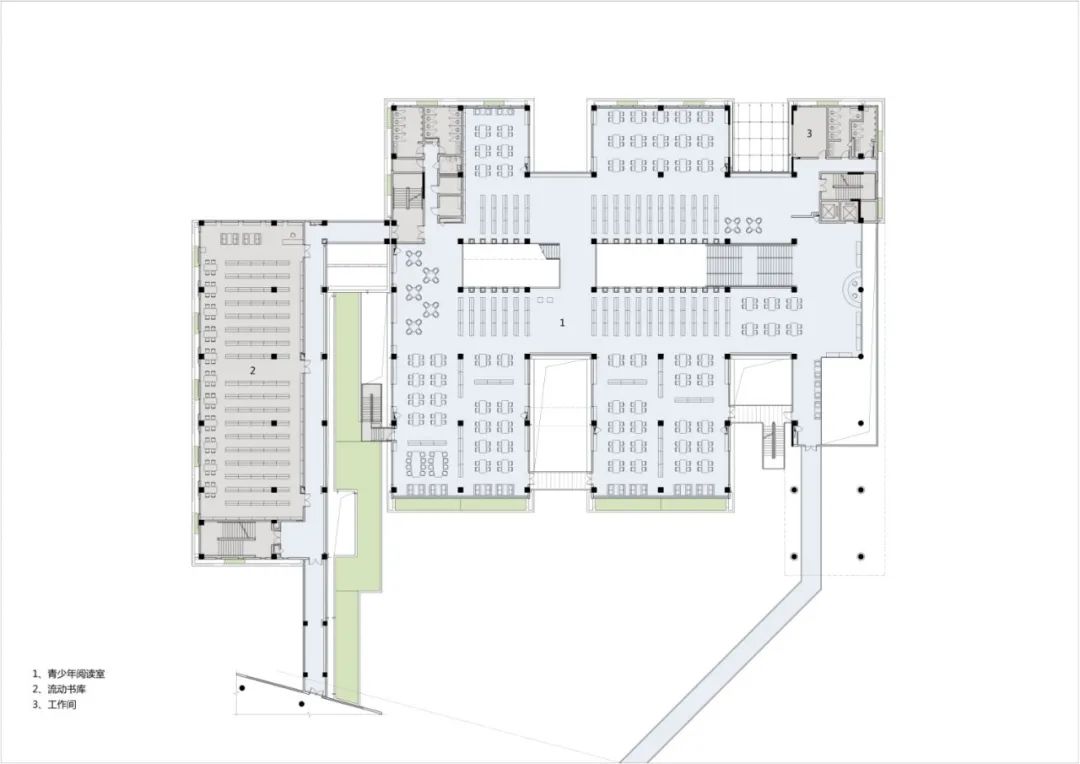二期青少年阅览空间需兼顾活动、展览、沙龙等多样化的空间需求,1~3 层采用了大进深布局,同时在体量上采用退台的形式,使每层的阅览空间都有如同首层的户外庭院感受。