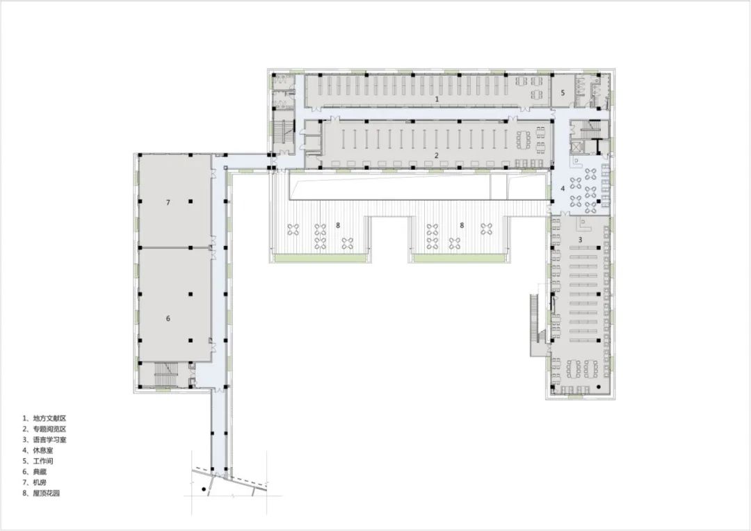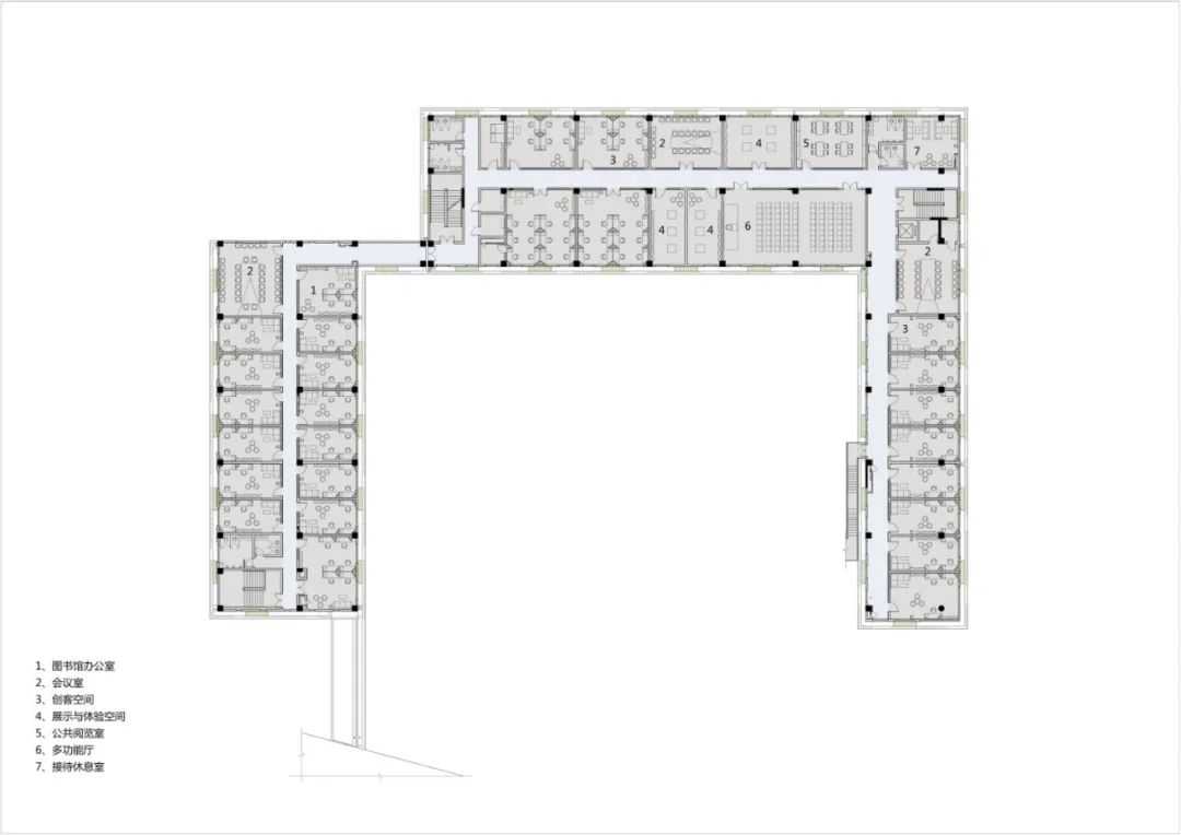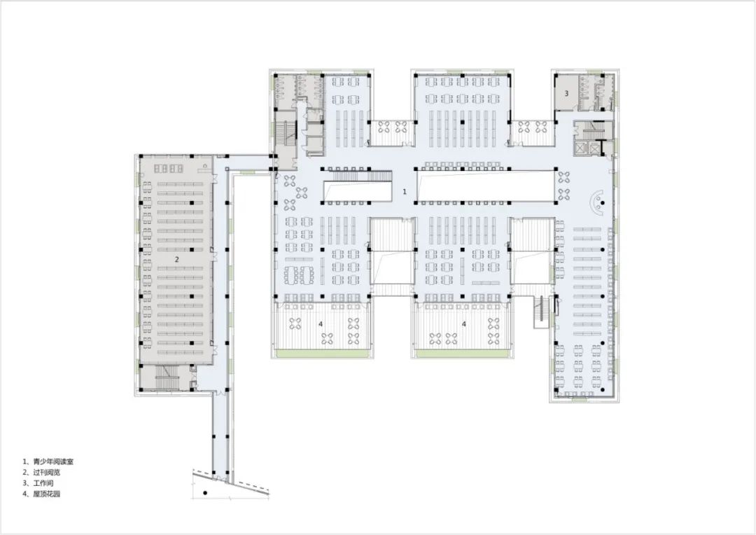 通过U形的平面布局,与一期主楼形成半围合式庭院,东南角打开的部分一方面使流溪河景观尽可能地渗入到建筑内部,另一方面有利于常年主导风东南风的引入,改善场地及建筑的通风环境。考虑到二期青少年阅览空间需兼顾活动、展览、沙龙等多样化的空间需求,1~3 层采用了大进深布局。