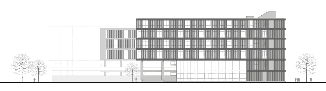 项目东、西、北三侧为6层框架结构的箱体建筑,中心为2-4层的功能用房,东西两厢通过廊道与一期主体建筑各层相通。通过对空间结构上的平面和竖向分隔,使室内隔断灵活,能满足各种功能的需要。