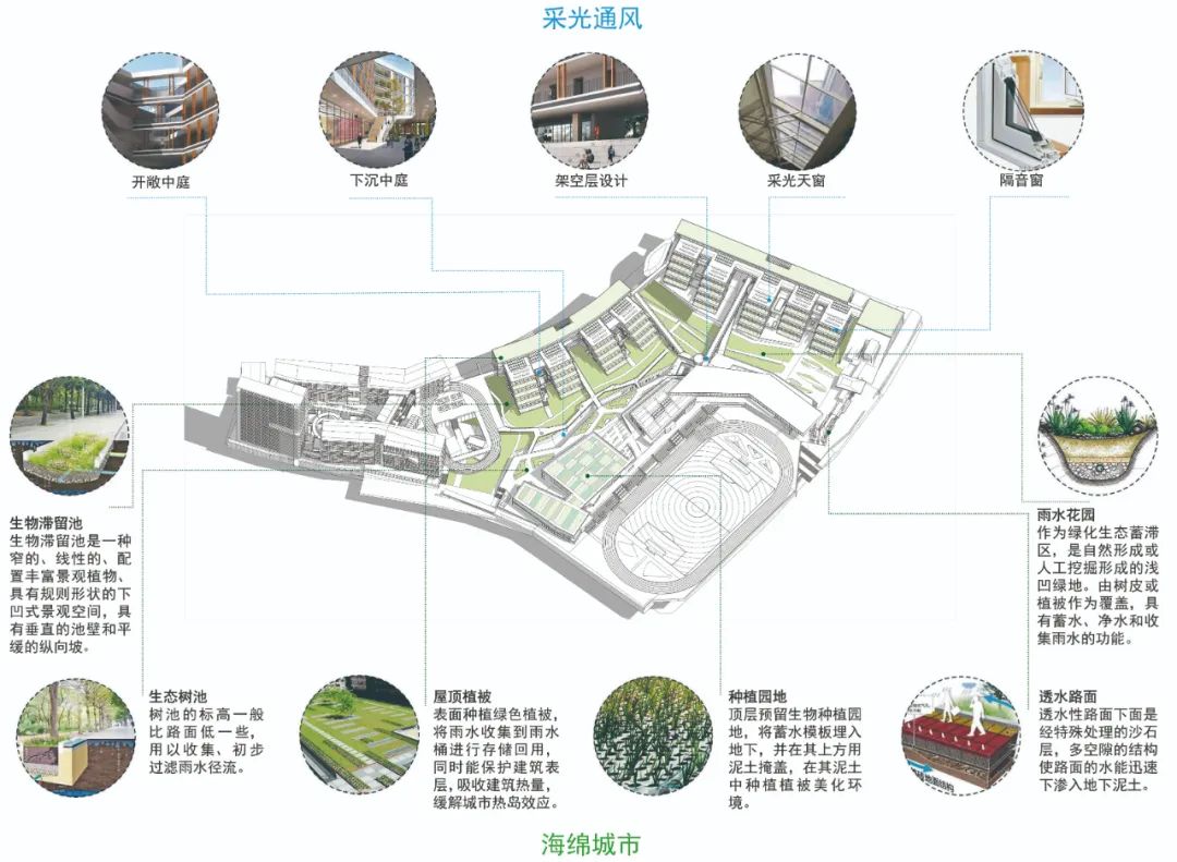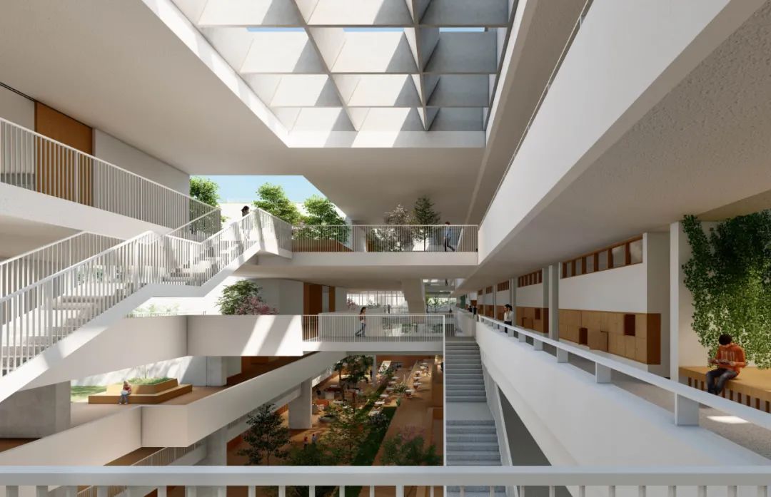 伞下空间的顶部窄,阻挡烈日的同时又可以让阳光漫射进来,天窗面积小,节省建造费用,底部开阔的空间可容纳多种多样的课外活动。