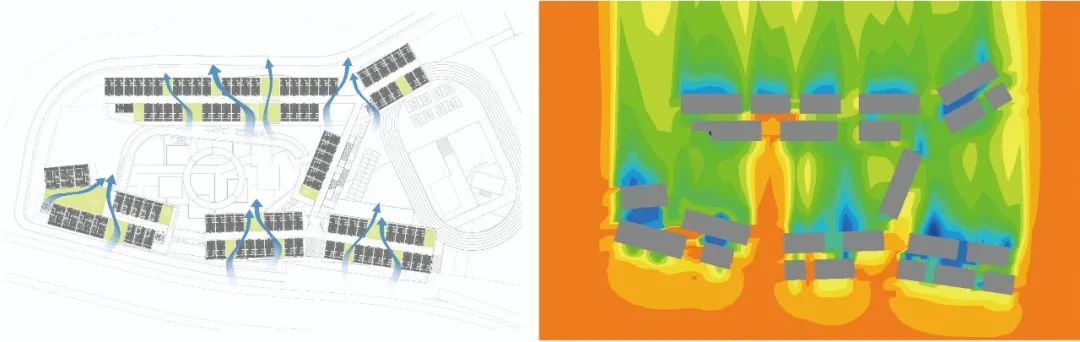 其次采用内廊布局,建筑通过一定间隔的错位开口,使风均匀的渗透每个角落,风从空中花园导入,经过空中花园绿化植被区和走廊的冷却,再从北侧开口流走,从而带走热量,获得舒适的体感温度和较低的空气龄。通过内廊式布局,增强自然通风的的均匀度,营造生态舒适的微气候环境,比单廊的方式更节能,同时,造价也更低。