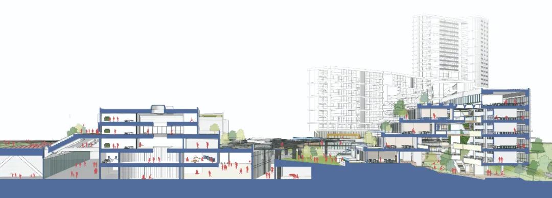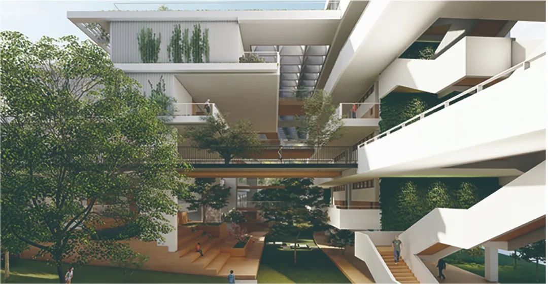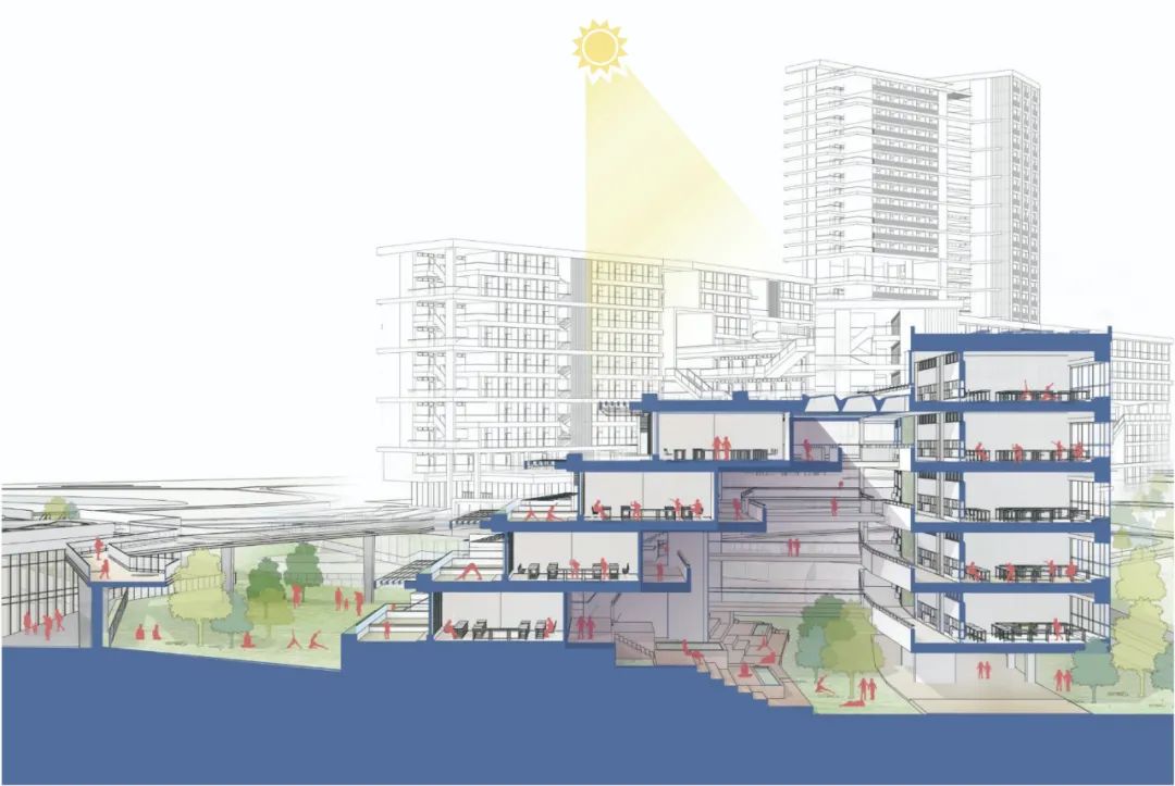 伞下空间,在亚热带炎热的气候条件下,首先要做的就是遮阳,我们退台式的建筑刚好在内部提供了这样一个伞下空间退台式建筑形式为内部共享空间起到遮阳的效果。