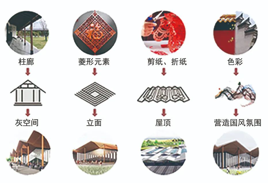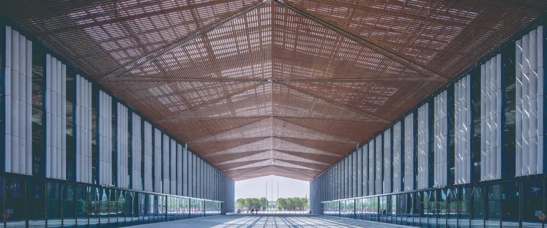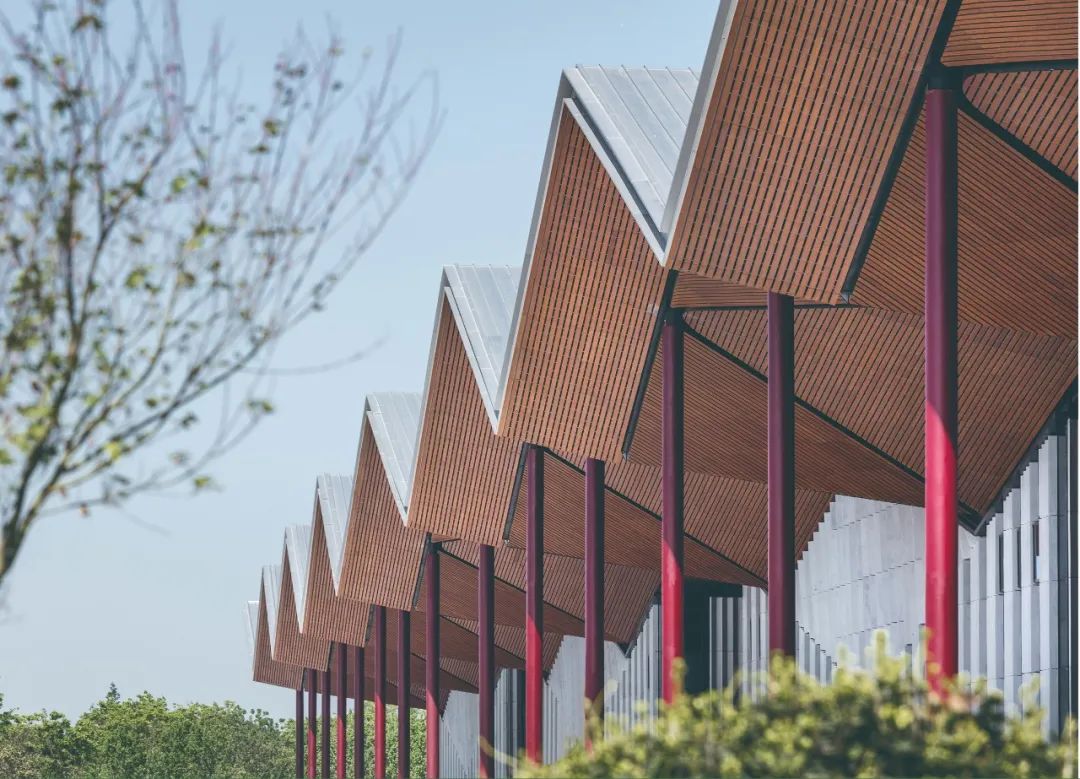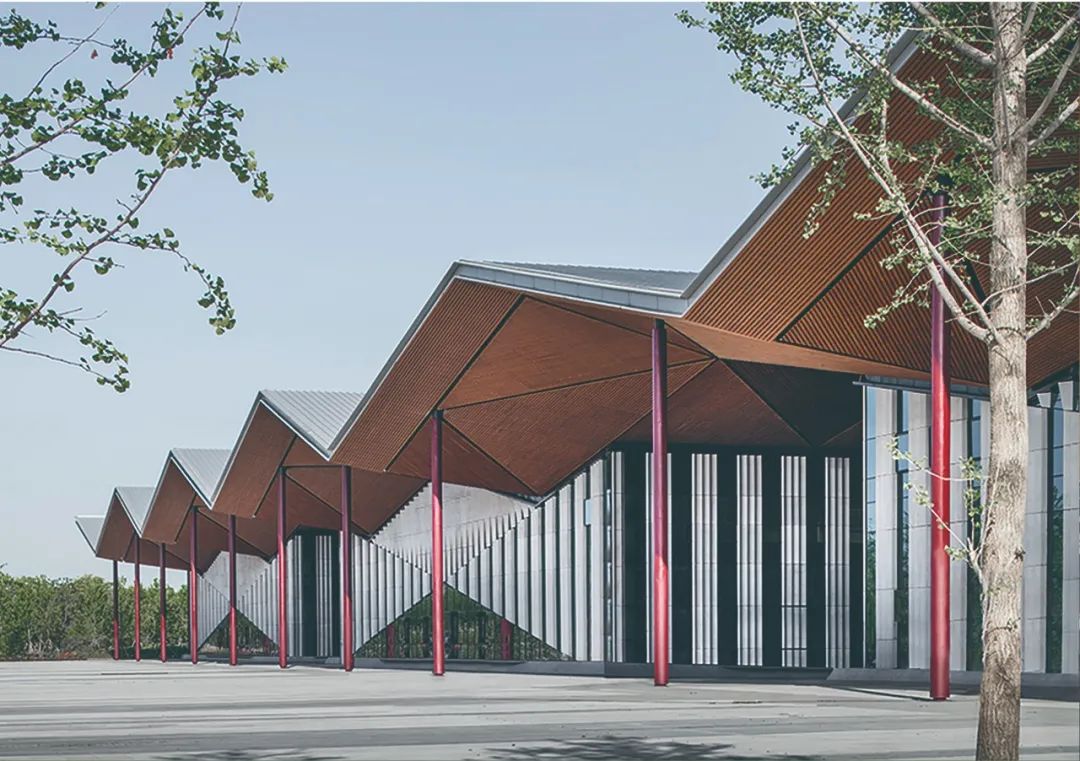 本项目造型设计中融入新时代下中国传统文化元素,彰显中华民族的精神。建筑连续的折叠坡屋面、色泽浑厚的檐廊空间和红色细长的柱子,整个建筑没有丝毫采用古典符号演绎,而是通过色彩运用与空间营造烘托中华民族的精神;南北通道的天光,透过竹木格栅均匀的到达地面,营造出柔和的、如林中散步的空间场所。