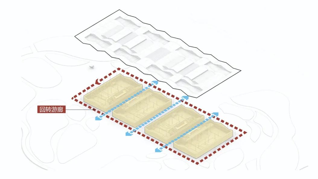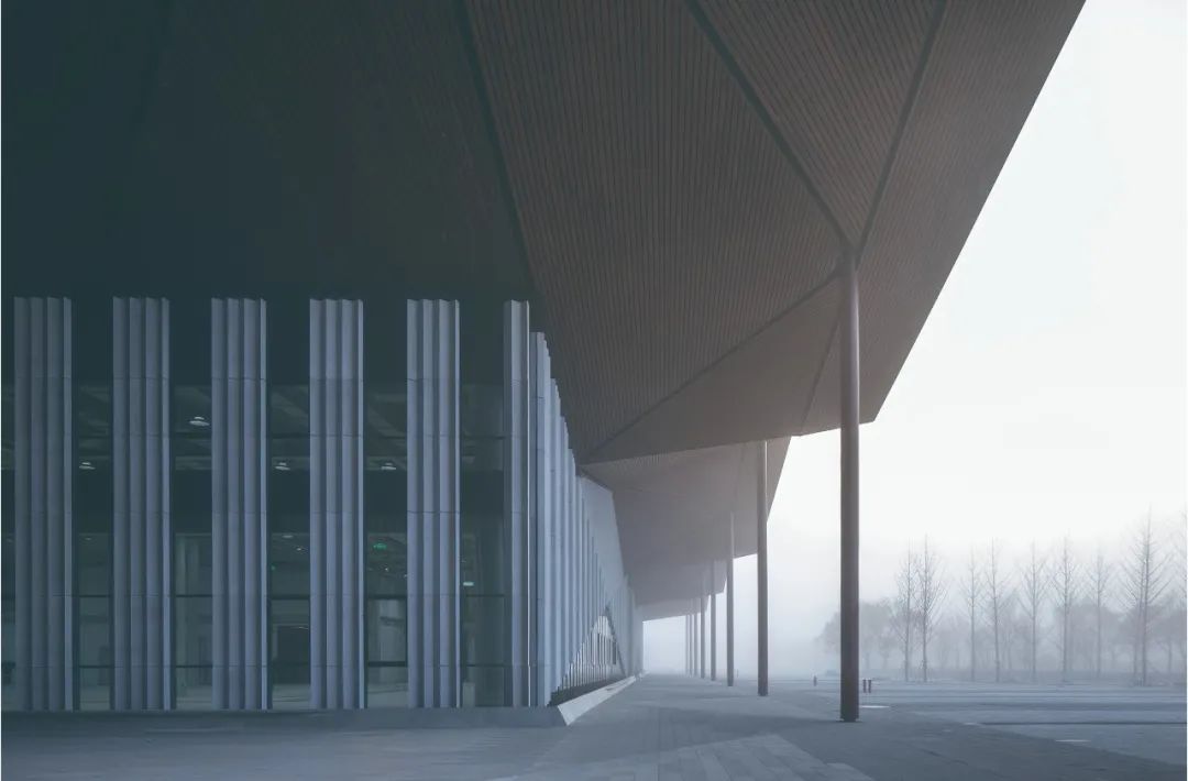 立面将折纸概念赋予GRC材料,组合形成机理独特、充满韵律的建筑效果。多种建筑材料有机结合最终形成了舒适、延续的室外檐廊空间。复兴馆在打造“新中国风”建筑的同时,还充分考虑建筑的生态、舒适。设计结合功能将体块划分为四个独立展厅,以折屋面覆盖形成大檐廊和南北通道,利于人群在其中自由穿梭,提高建筑使用者社会交往的能力。