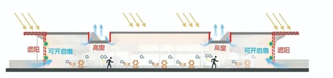 本项目为花卉展览建筑,建筑四周立面合理设置开启扇,室内为大空间开发区域。能有效提高室内换气次数并强化自然通风效果,采用了南北通透的开窗设计,有利于形成穿堂风,有效增强了自然通风效果。