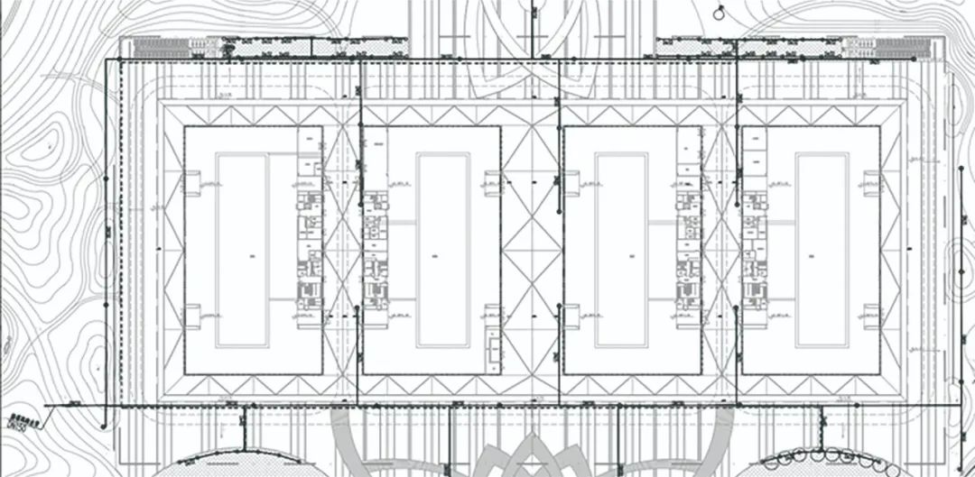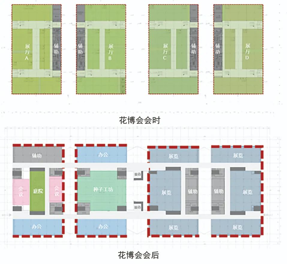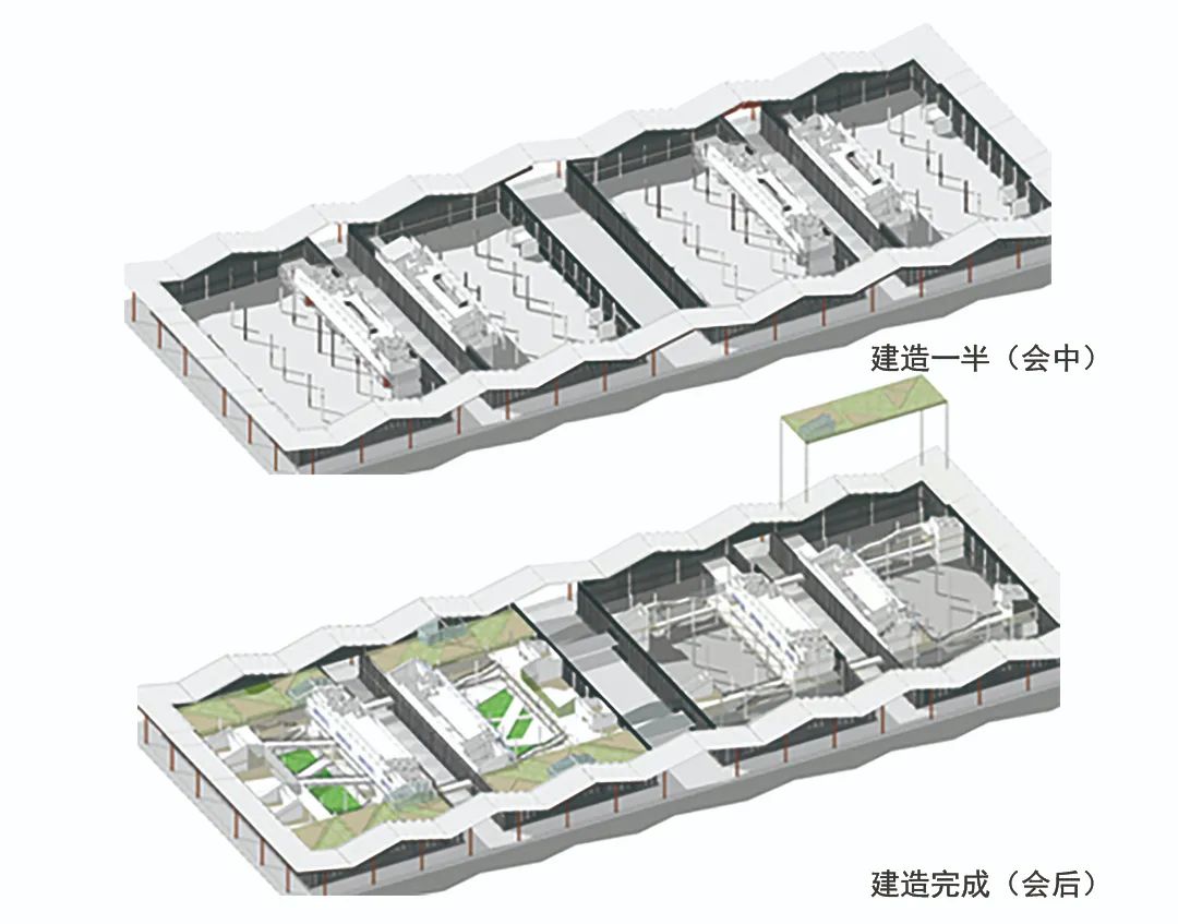 建筑设计为了平衡了41天展会瞬时使用与会后数十年的使用功能,创新出兼顾展会和会后永久功能的综合设计方式。场馆建造一半,通过末端的设备布置调整举办展会,会后继续建造完成最终的建筑功能(绿植超级工厂及研发基地),将可持续设计理念运用到极致,场馆为未来使用用途预留内部空间分隔空间,体现了建筑适变性。