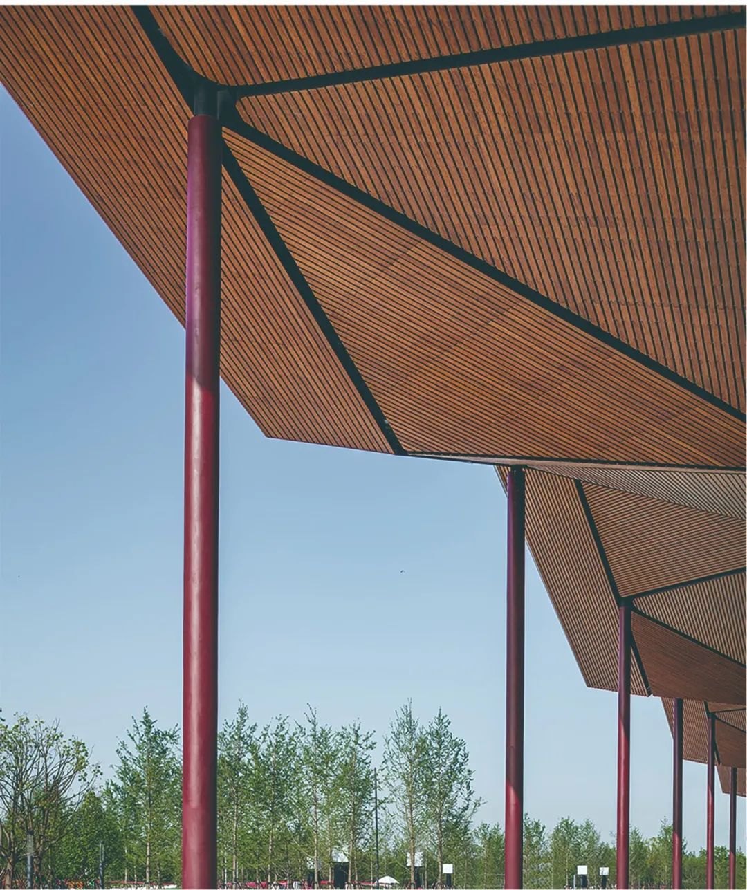设计师们运用了构成的手法,把中国的传统折纸的概念复制到了“复兴馆”的屋面上。拿一张长方形的软卡纸,通过虚实折线,便可以把复兴馆的屋面折叠完成。屋面轻盈舒展、表面的金属材质可反射阳光及周边的环境,更加增添了建筑的轻盈感,仿佛纸片漂浮于花海之上。檐廊下的吊顶模仿中国传统剪纸艺术的效果,通过多个三角形巧妙的拼接形成翻折律动的顶部变化,营造出奇妙的檐廊空间。吊顶下超细直径的红色柱子和屋面巧妙的连接,使屋面的感受更像是被拉住而非支撑,整体意向更加轻薄向上。
