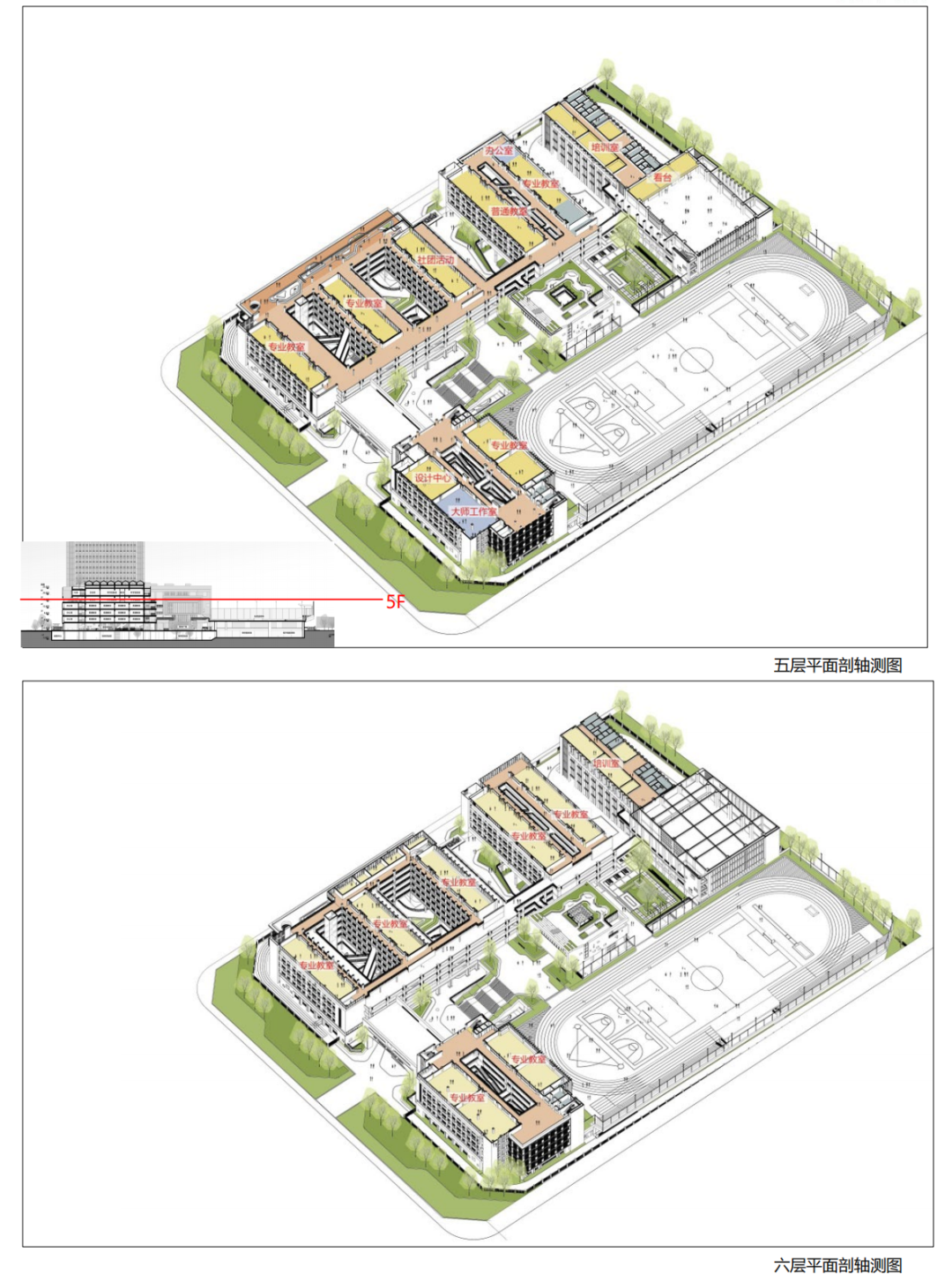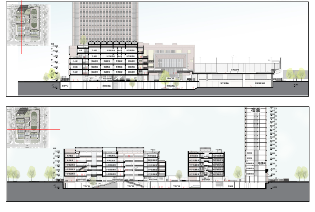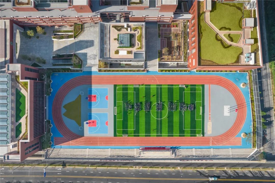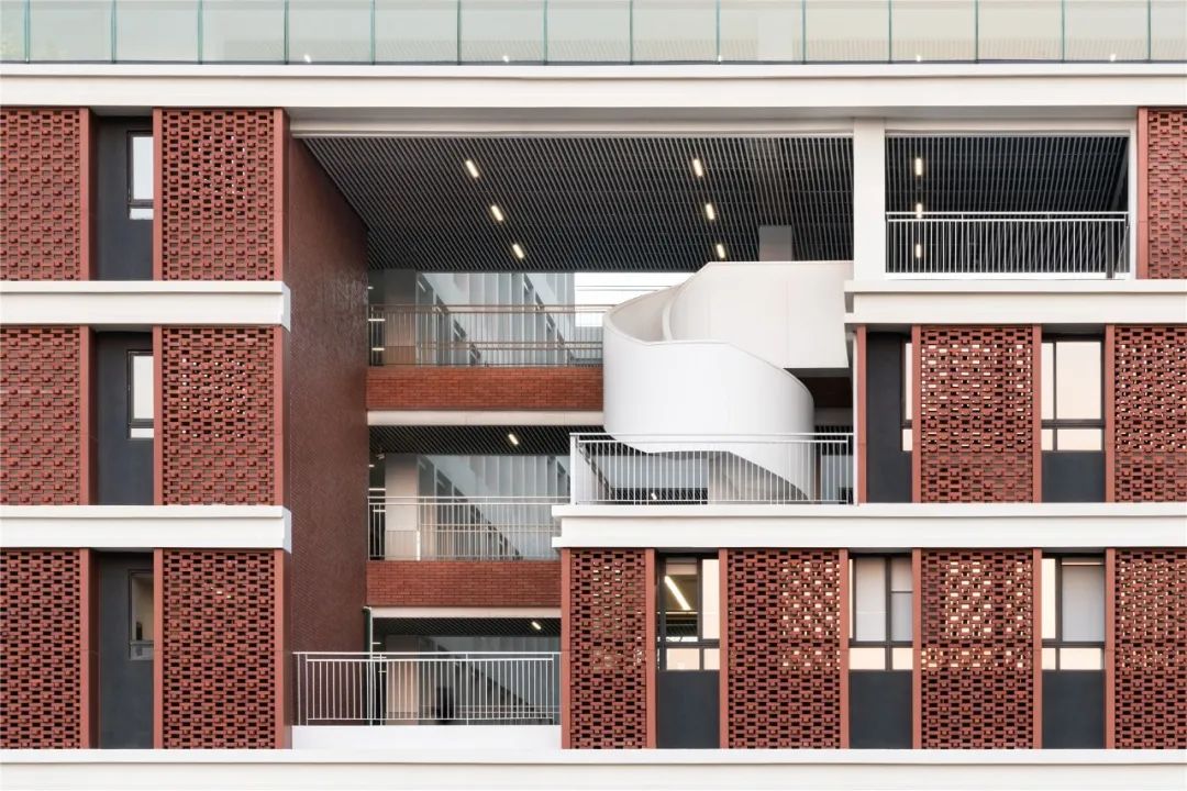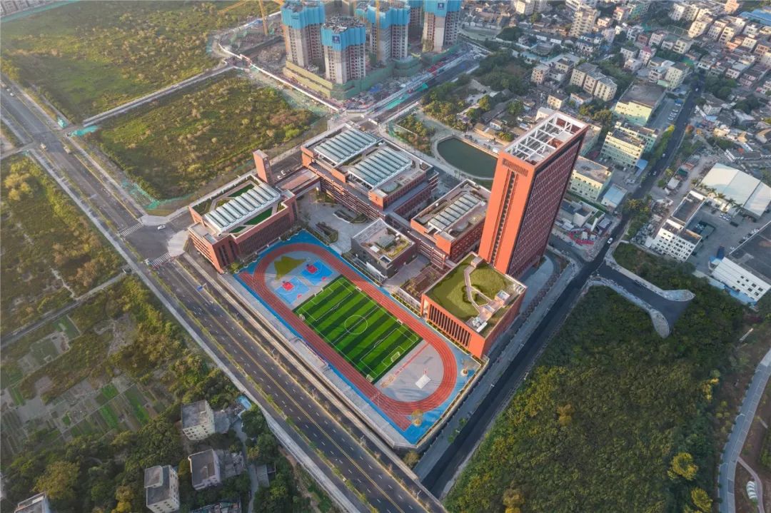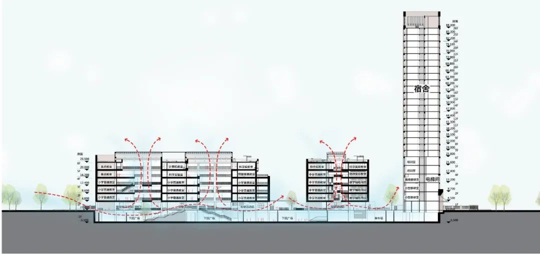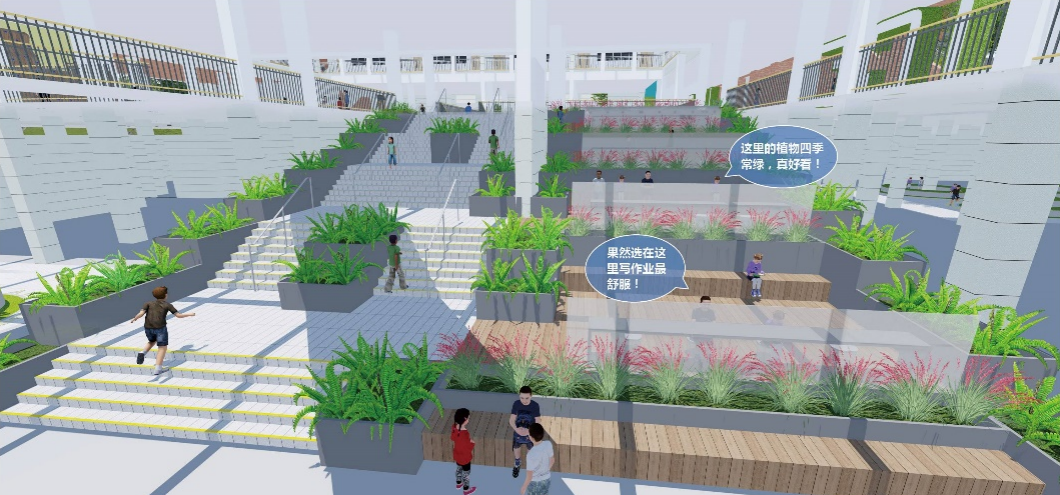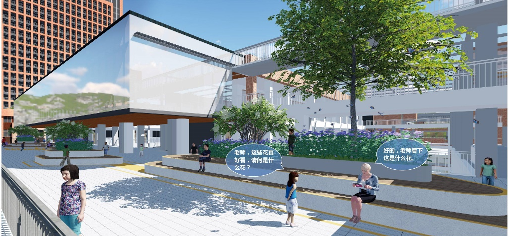 作为深圳高密度发展的典型项目,设计结合中小学生活动特性,用立体书院布局模式,将师生活动场地及绿化系统脱离地面,植入建筑各层空间,打造多维立体的课外休闲活动空间,从而引导师生进行休闲交往、户外体验等活动。