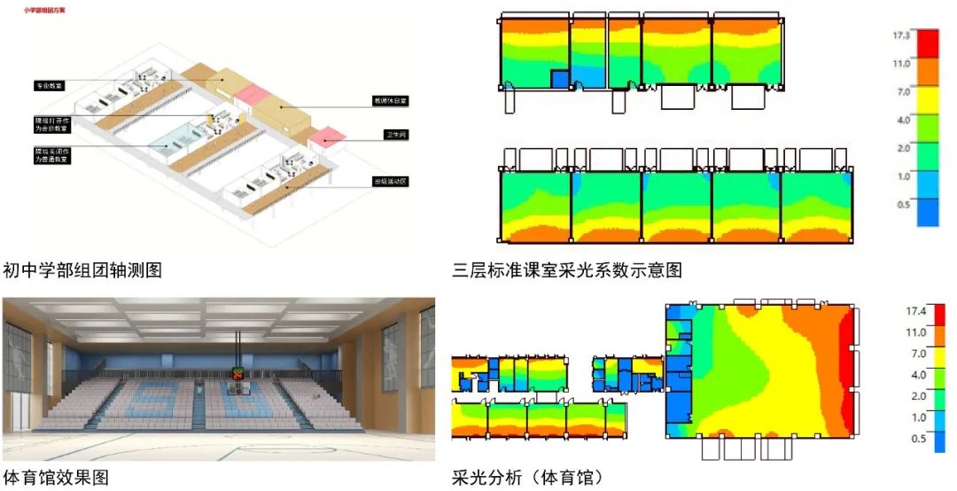 本项目在整体动静分区明确的前提下,结合噪音分析对有限的噪音进行降噪处理;对室内外环境分别进行了日照分析和采光分析,最大化采用天然采光的前提下和人工照明协调使用的解决照明;进行了室内外通风分析,保证良好的热湿环境;结合深圳湿热地区气候特点,设计智能天窗和无风雨连廊,结合立体庭院绿化,打造高舒适性校园环境。
