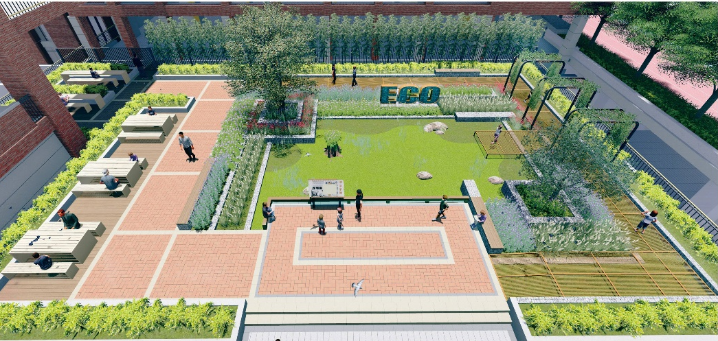 海绵城市科普园:该区 域周围分别相邻行政楼、 中学教学楼、教科硏培 训中心及运动场的一个 交通节点也是一个重要 的视觉节点,沿用建筑 设计提出该区域是水体 的形式,为学生、教师 提供一个户外休闲、生 态探索的水体景观节点中引导学生学会探索,学 习与实践并重。