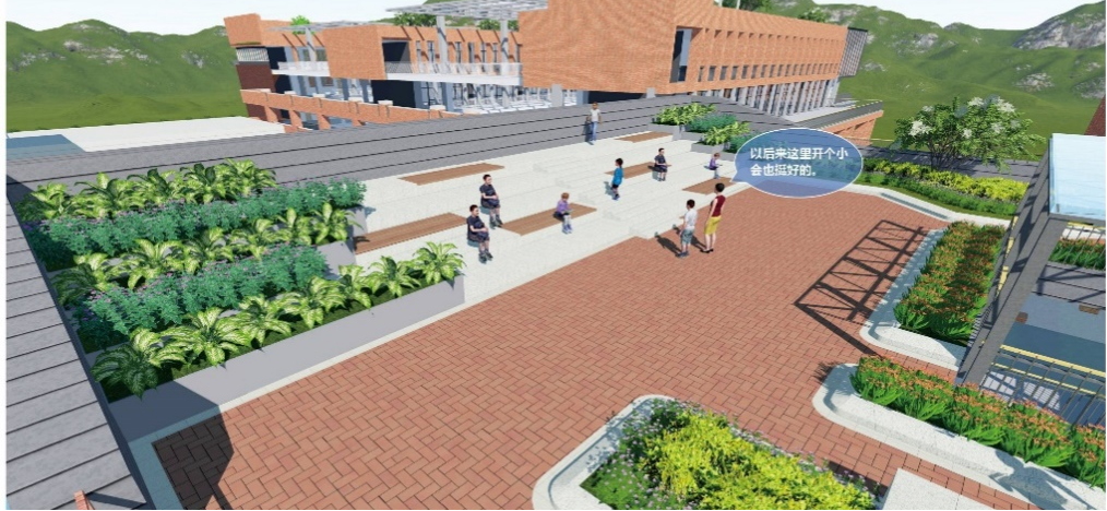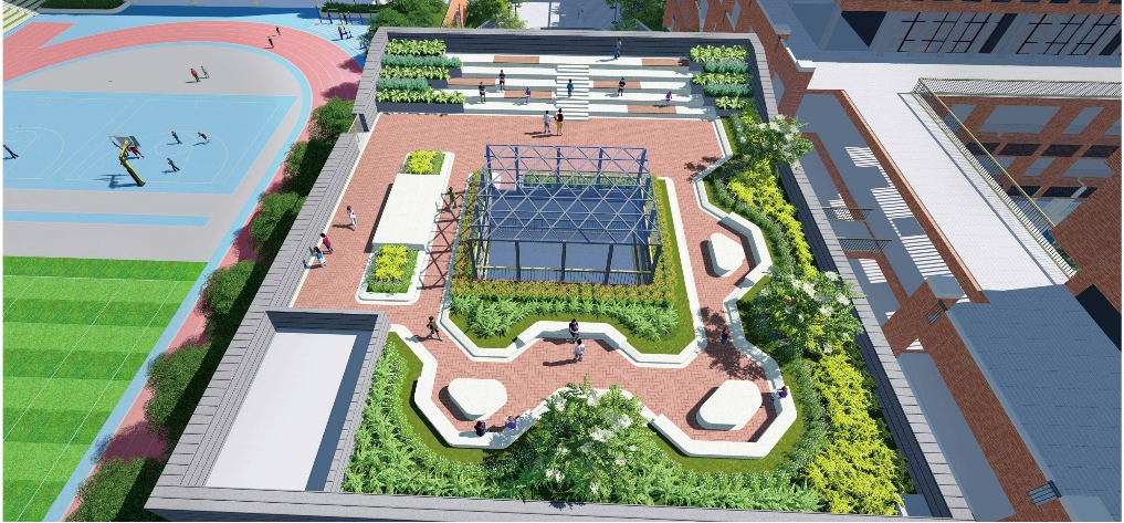行政楼顶层:该区域为老师的 场地。采用现代中式设计手法, 曲折蜿蜒的步道扩大该区域的空间感,同时景观节点与停留点相呼应,增加空间景观多样性。