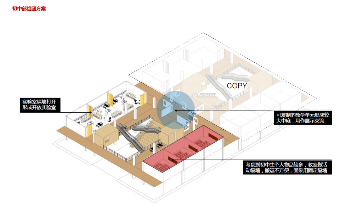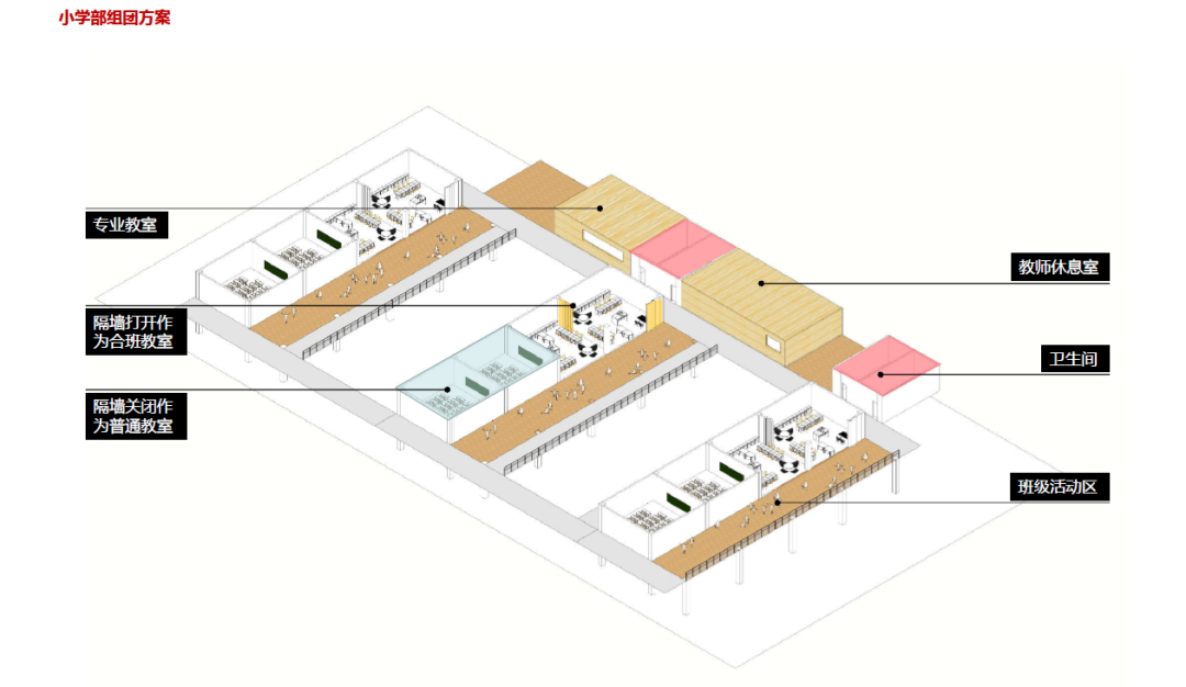 小学部部分楼层采用“一房一厅”的空间布局方式,组团包含普通教室,专业教室,教师休息空间,班级活动空间,通过加宽走廊和活动隔断实现教室与走廊的空间连通,将走廊空间纳入“泛教室”空间。