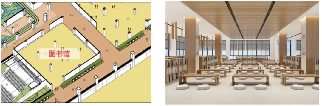 周围分别 相邻行政楼、小学教学楼 及运动场,是一个重要的 交通节点,在此增加中式 景观以提升校园形象。