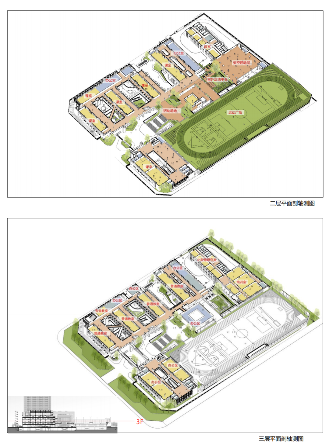 中学与小学部屋面教学区: 屋顶考虑设置田地、天文观景点、植物种植地进行多种有特 色和针对性的户外教学,设计 中以折线变化的园路以及帯有 微地形的景观满足小学生好奇、 爱玩的心理需求,并且采用学 习与实践相结合的教学模式。