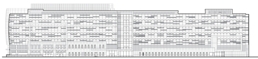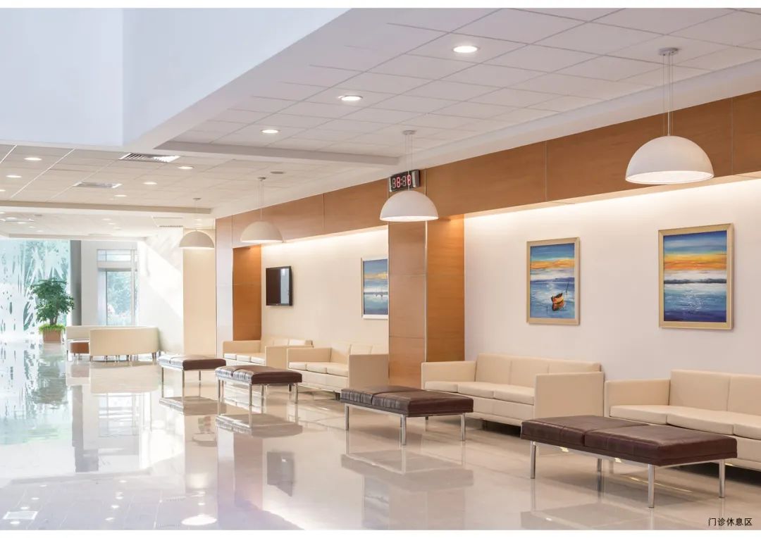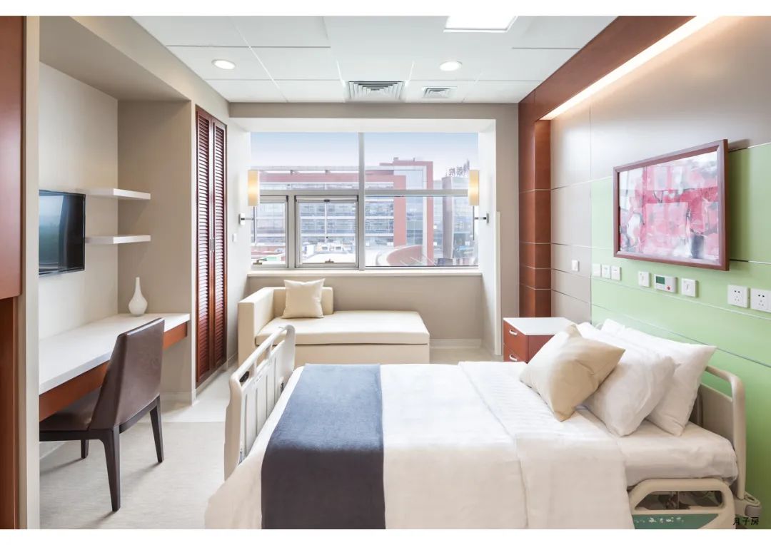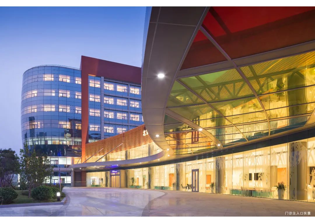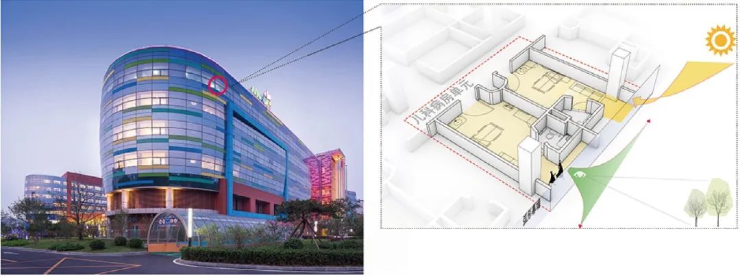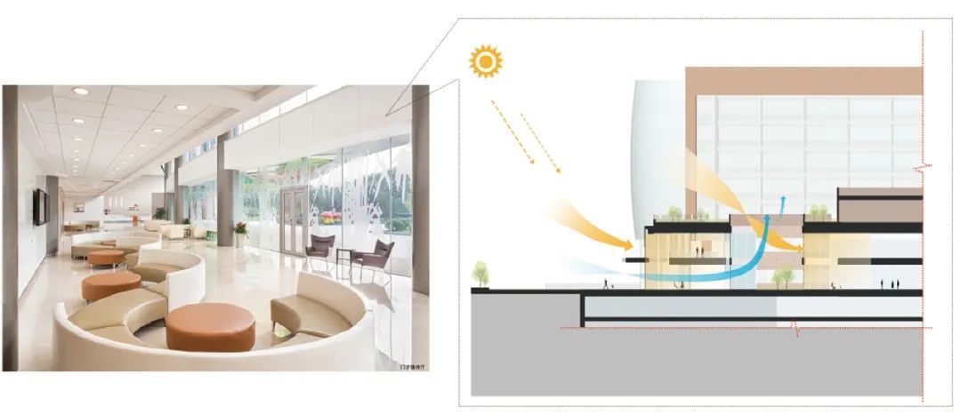 建筑外立面玻璃幕墙的彩釉涂层可以减少紫外线进入室内,起到遮阳的作用;三维曲面的玻璃幕墙使室内可视范围最大化,尽可能将自然光线引入每个角落,尤其是病房和走廊,使之光线充足。