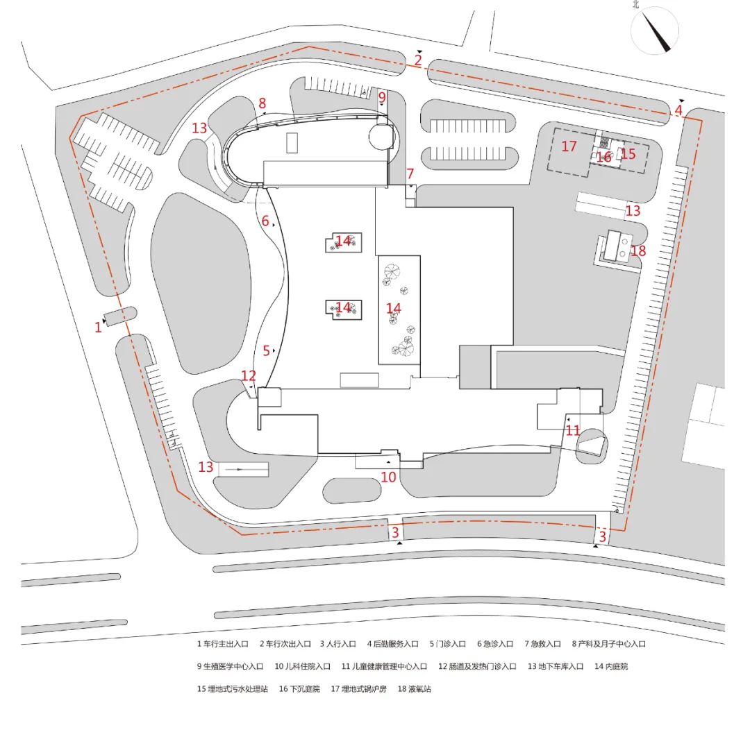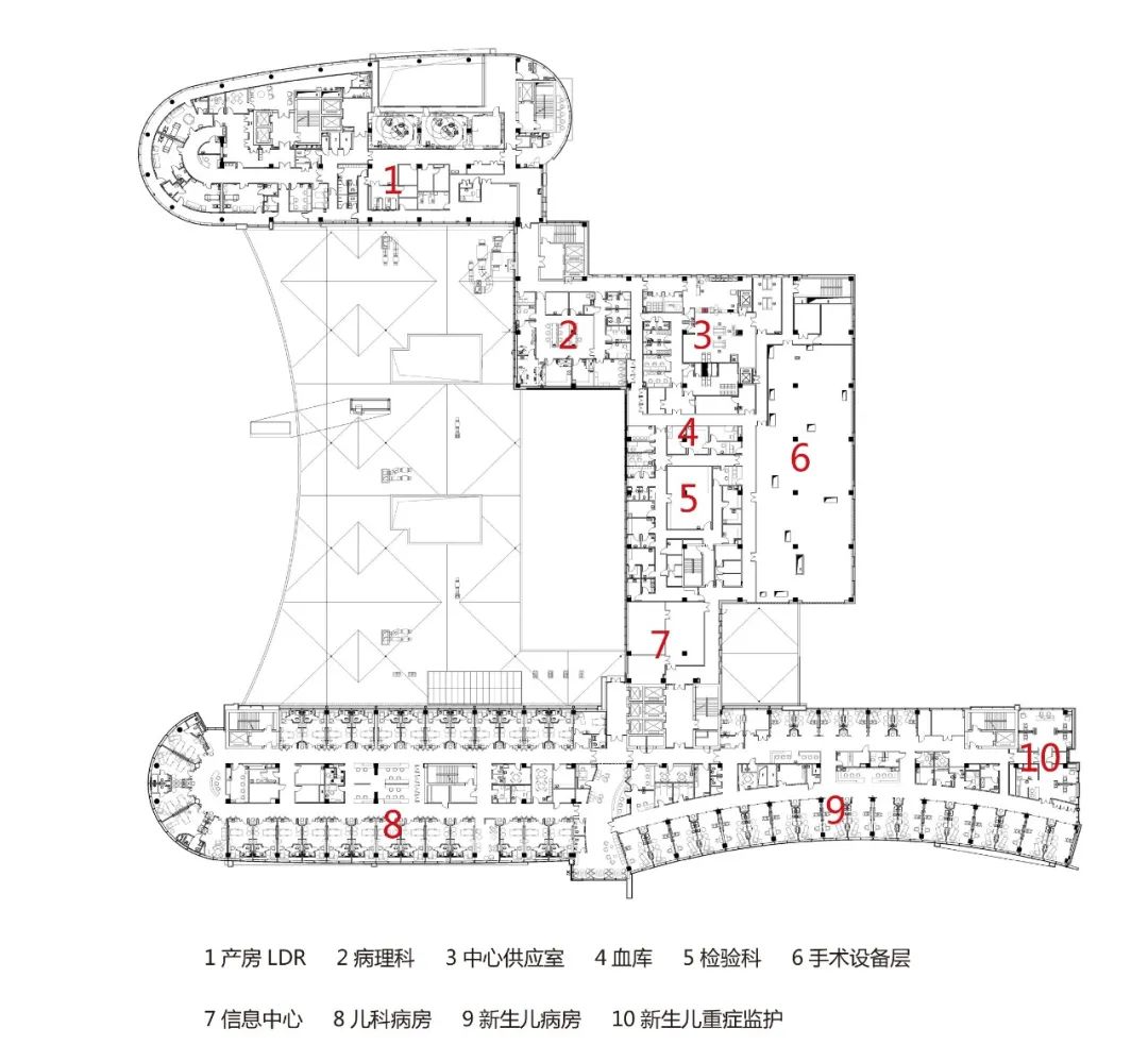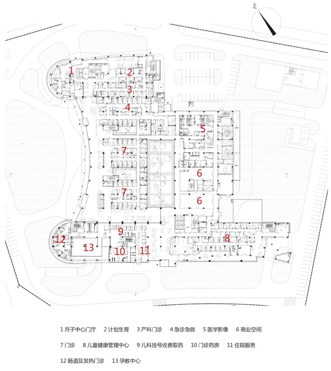 布局上,将“妇”与“儿”两类患者分别布置于南北两端,各自成区,独立进出,避免相互影响;而中心位置的门急诊、医技等部门则共同服务于两部分患者,从而使医院高效运转。