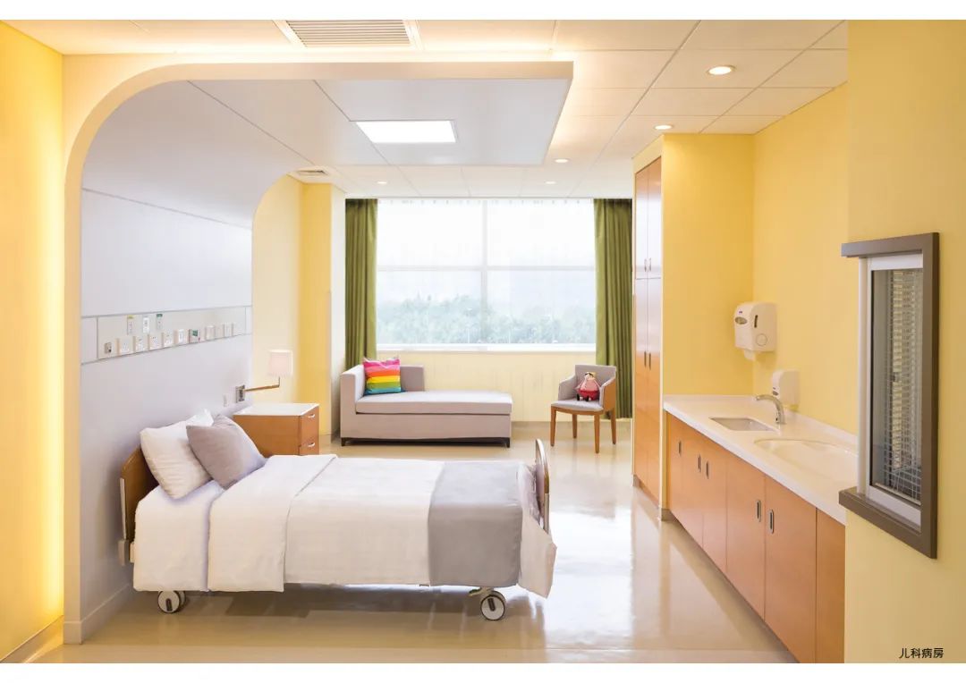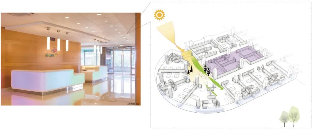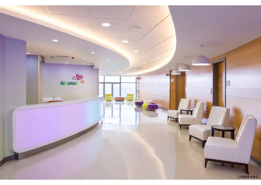 为患儿设计儿童喜好的色彩灯光、艺术长廊,营造轻松愉快的就医氛围;为产妇及家属提供家庭式舒适的休养空间和酒店式周到服务。此外,开敞内院将阳光、空气引入建筑内;进行室内外风环境、光环境及环境噪声模拟分析并采取相应措施,以及采取机械与自然的混合通风策略等,提高建筑物环境的舒适性。