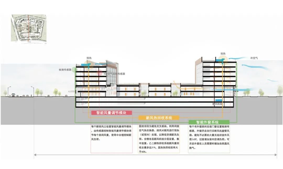 对于寒冷地区的医院建筑,全专业采取措施,节约能源,提升舒适度:基于能耗模拟优化设计高性能围护结构,平面布局尽量加大建筑展开面,使尽可能多的房间(尤其是走廊、大厅等公共空间)具自然采光通风条件。设新风热回收系统,利用间接热交换,排风对新风进行预热(或预冷)处理,降低新风负荷,显热热回收效率大于 65%。