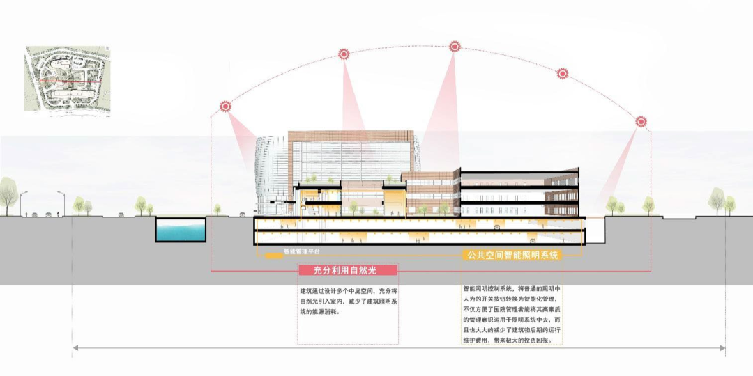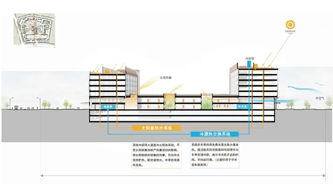 对于能耗较高的医疗建筑:通过主被动措施结合,促进舒适性、能效性和环境保护等方面的均衡;通过自然通风与机械通风相结合的方式,使室内全年空气清新通畅,确保舒适的室内微气候环境;通过新风热回收系统、太阳能热水系统、城市中水系统、高效供热系统、智能照明控制系统等技术运用,为实现绿色建筑、健康建筑提供保障。