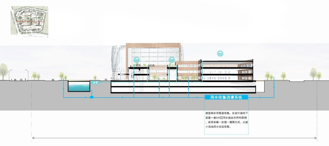 利用市政中水,冲洗楼内便器、作为雨水灌溉回用水补水,达到节约用水的效果。屋面雨水用管道收集,在室外绿地下设置一座 500 雨水综合利用构筑物,采用收集—处理—灌溉方式,以减小场地雨水径流系数。院区室外绿化、道路冲洗选用回用雨水,绿化灌溉采用微喷灌方式。