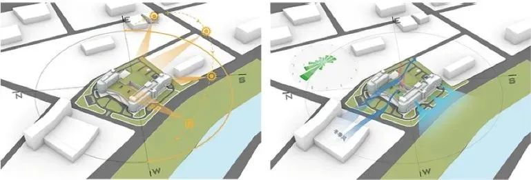 主体住院楼面向南侧河道呈南北向布置,获得最优的景观、日照与通风,并采用合理的层高和竖向体系,使建筑及室外环境之间形成有机联系。场地内采用自然植物覆盖的下凹式绿地,从而增加场地雨水与地下水涵量,减轻市政排水系统负荷,并将收集的雨水用于绿地灌溉、道路冲洗等。作为医疗建筑,对于噪声控制、射线防护、垃圾及污废水处理等等,因地制宜地采取先进合理措施,保障环境安全。