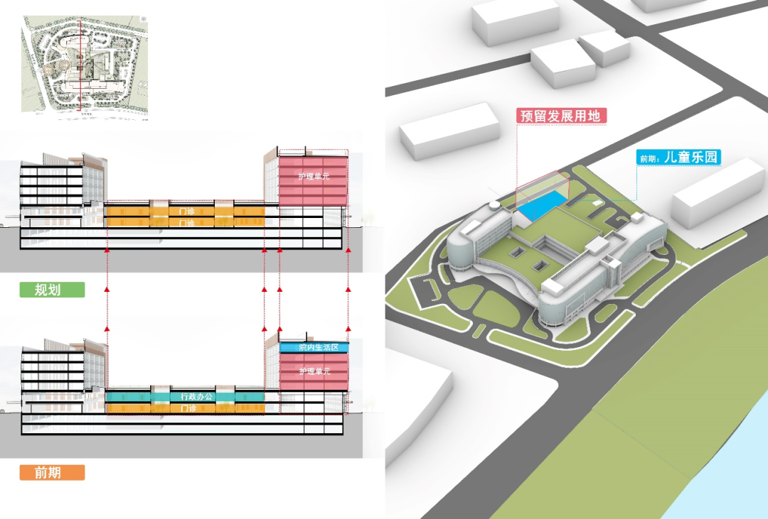 本项目为医疗建筑,功能布局上以开敞的中央花园为核心,各种功能紧凑布局;并结合近远期规模需求合理规划,做到门诊医技、住院、科研教学、院内生活等预留扩展空间:在院区预留用地,可与妇产楼相结合,作为妇产科的扩展;门诊顶层的行政办公区作为门诊、医技的发展空间;影像中心南侧的餐厅可作为影像中心的发展空间;儿科病房楼七层本期作为后勤、会议区,将来可改作护理单元。通过这样的规划,使医院未来扩建后的医疗流程继续保持原有秩序而不会被破坏。