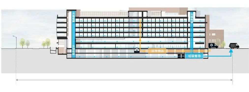 合理组织建筑空间及动线流程,集中接收、回收或安全处置危险物品,如医疗垃圾、传染性物质、有毒物质、放射性物质等。对于建筑运行中产生的噪声、废气、废水污染,进行积极应对;建筑物通过植被、道路等与周边环境进行分隔,避免相互影响。