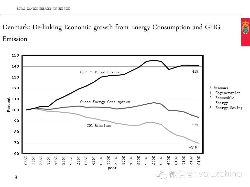 丹麦驻华大使馆能源与环境商务参赞Lars Eskild Jensen的致辞,展示了丹麦能源政策和住宅现状,丹麦的经济增长与能源消耗和温室气体排放曲线图,让人印象深刻。