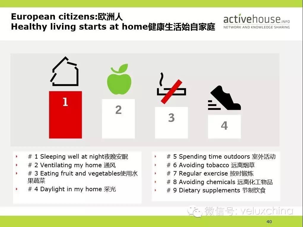 Active House主动式建筑国际联盟主席KurtEmil Eriksen详细阐述了主动式建筑的愿景、细则、指南及评价体系,从2015年对12个国家1万2千个欧洲家庭的健康建筑调查报告中,不难看出,占据人们健康生活首要地位的是舒适的建筑,这也是主动式建筑所关注的。