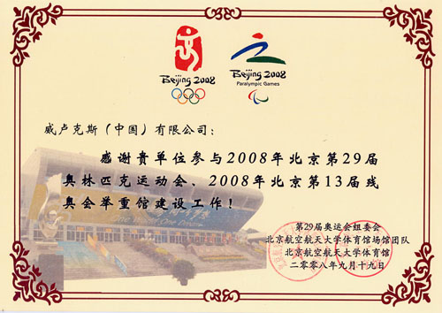 近日,威卢克斯(中国)收到了来自第29届奥运会组委会颁发的荣誉证书,以感谢威卢克斯(中国)有限公司在奥运场馆建设的支持工作。