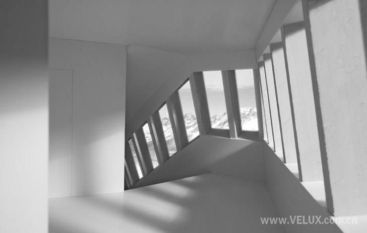 卧室设计了比较小的窗户,给人一种私密安全感,以此强调别墅原有的实用功能。这些窗户遍布建筑的整个立面,从而消除了不同楼层之间的隔离感,同时突出其水晶般的结构特点。在建筑立面使用的是屋顶窗,这是人们很少看到的。那是因为这座别墅出现了很多斜面结构,从结构角度上混淆了屋顶和楼面的界限,所以,这就要求窗户也要沿斜面安装,从而保证了立面和屋顶之间的连续性。在这里使用威卢克斯\VELUX屋顶窗,可以说是神来之笔,它们完美地实现了采光要求,屋顶窗的传热系数为1.0W/m2k,能有效的降低建筑能耗。在新蒙特罗莎别墅安装屋顶窗之前,设计人员专门进行了模拟实验,确保它们能够满足这里抗强风破坏的要求。
