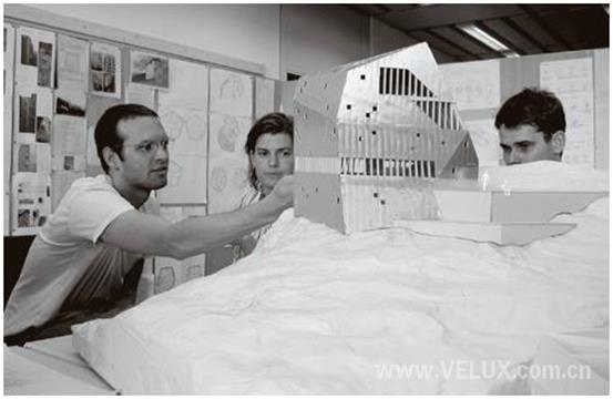 苏黎世联邦高等工业学院学生正在设计室中工作,新蒙特罗莎别墅的建筑构思就是在这里形成的。