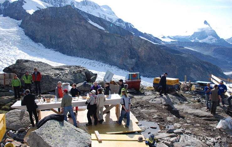 在校庆过去三年以后的今天,来自苏黎世联邦高等工业学院、瑞士阿尔卑斯俱乐部、卢塞恩大学建筑与技术专业、瑞士联邦材料测试与开发研究所(EMPA)的数十位工程技术人员,仍在能源平衡和生命周期分析方面孜孜以求,他们秉承智能建筑服务理念,力求找到最理想的建筑立面,并以对环境环保的运输方式,将建筑材料运送到了海拔2,883米,且与外界隔绝的建筑施工场地。