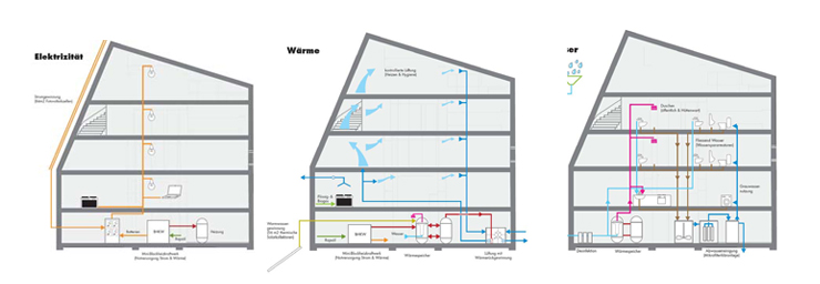 此外别墅还配备了一个以油菜籽油为燃料的综合热电厂补充供应,以满足高峰需求期的能源要求。通过热力回收技术实现废气热量的回收利用。人体散发的热量也是一个重要因素,它的充分利用对居室热能需求起到了很大作用。当别墅需要大量热能供应,或入住客人很多时,需要使用额外的太阳能确保热力供应,这一问题通过面积为35平方米的太阳能集热板可以实现。别墅的通风以机械方式进行,屋顶窗同时可以打开,以照顾那些喜欢享受阿尔卑斯地区新鲜空气客人的需求。